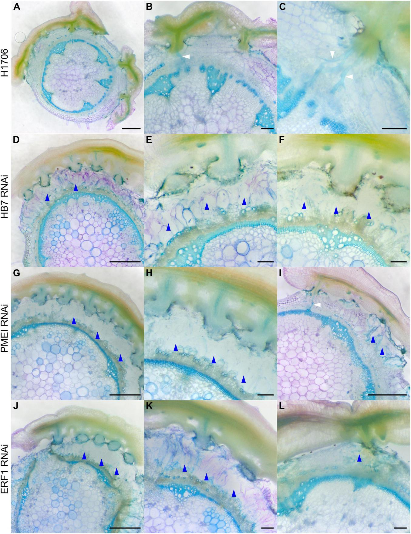 Haustorium phenotypes of C. campestris growing on Heinz tomato wild-types and HIGS RNAi transgenic plants. C. campestris haustoria that were growing on wild-type H1706 tomato hosts (A–C), on HB7 RNAi transgenic tomato plants (D–F), on PMEI RNAi transgenic tomato plants (G–I), on ERF1 RNAi transgenic tomato plants (J–L). (A,D,G,I,J) Scale bars = 1 mm. (B,C,E,F,H,K,L) Scale bars = 200 μm. (A–L) 100 μm thick vibratome sections of fresh haustorium stained with Toluidine Blue O. White arrowhead indicates normal haustorial vascular connections. Blue arrowhead indicates the phenotype of overly degraded host cortex cell walls.