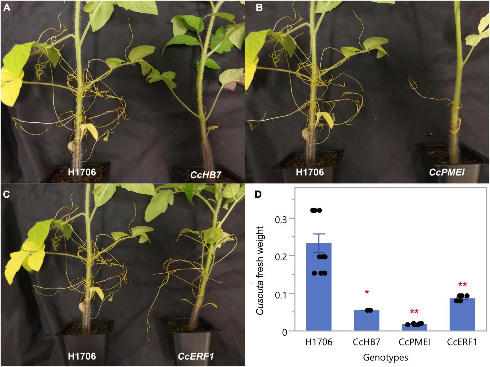 Phenotypes of C. campestris growing on Host-Induced Gene Silencing (HIGS) RNAi transgenic plants. (A)C. campestris growing on wild-type H1706 tomatoes and T1 CcHB7 RNAi transgenic plants. (B)C. campestris growing on wild-type H1706 tomatoes and T1 CcPMEI RNAi transgenic plants. (C)C. campestris growing on wild-type H1706 tomatoes and T1 CcERF1 RNAi transgenic plants. (D) Averaged biomass of C. campestris growing on wild-type H1706 tomatoes and T1 CcHB7, CcPMEI, and CcERF1RNAi transgenic plants. Fresh net weights of C. campestris were measured in grams (g). Each data point represents one tomato plant (biological replicate). Data presented are assessed using Dunnett’s test with wild-type H1706 as control. “*” p-value < 0.0005. “**” p-value < 0.0001.