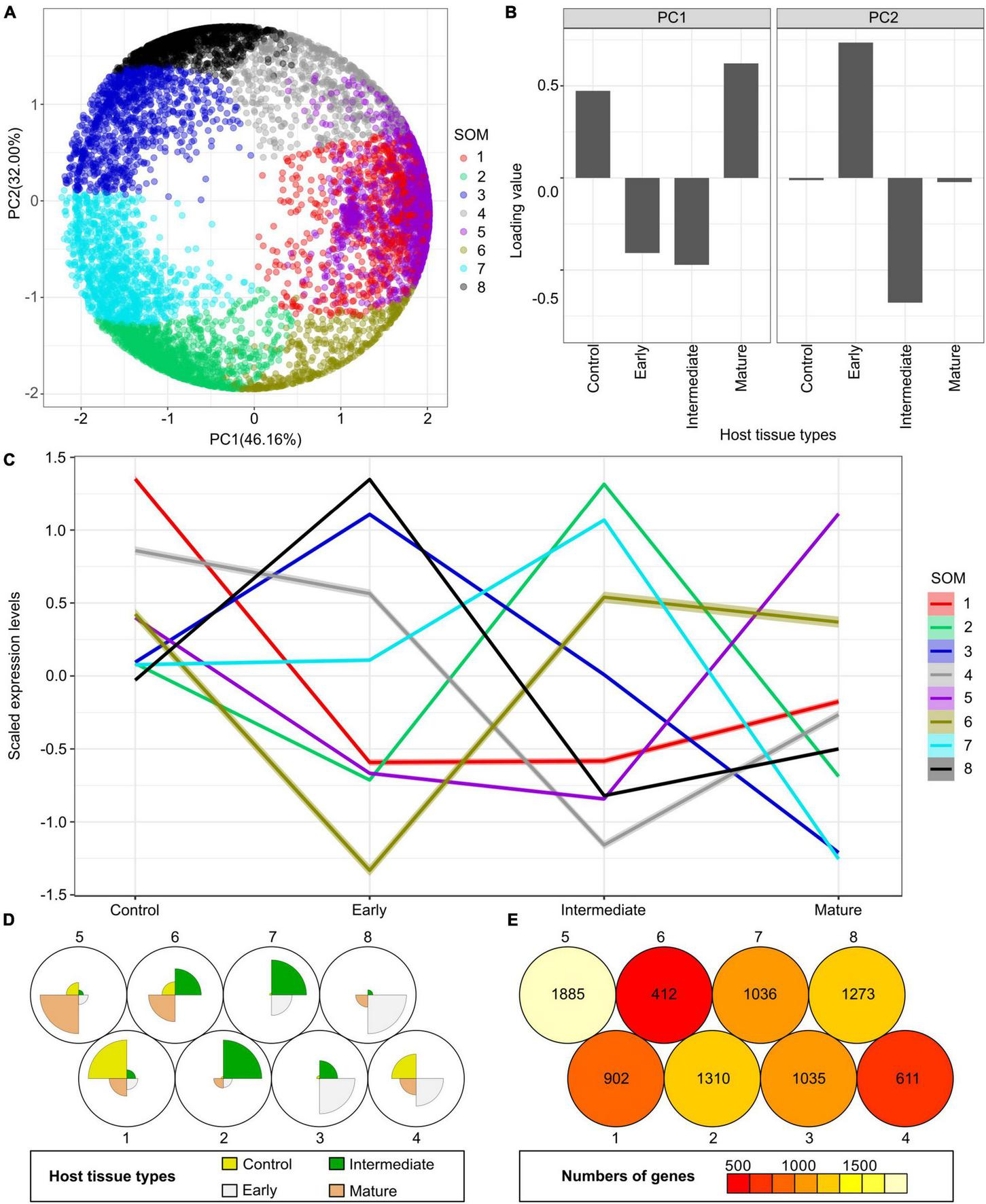 Principal component analysis (PCA) and self-organizing maps (SOM) clustering of LCM RNA-Seq data from the host tomato tissues surrounding C. campestris haustoria. (A) PCA plot of the first and second principal components (PC1 and PC2) and colored indicate their corresponding SOM groups. Each dot represents a gene. (B) Loading values of PC1 and PC2. “Control” means the tomato stem cortex tissue samples that are not next to C. campestris haustoria, which serve as negative controls in this experiment. PC1 separates the genes specifically expressed in host tissues sounding the early and intermediate-stage haustoria from those specifically expressed in other stages. PC2 separates the genes specifically expressed in host tissues surrounding the intermediate-stage haustoria from those expressed explicitly at the mature stage. (C) A plot of each SOM group’s scaled expression levels at four types of host tomato tissue surrounding C. campestris haustoria at different developmental stages. The color of each line represents the SOM group it belongs to. The shaded area around the lines indicates the 95 percent confidence interval. (D) A code plot of SOM clustering showing which developmental stage predominantly expresses genes of each SOM group based on sector size. Each sector represents the host tissues surrounding C. campestris haustoria at a specific developmental stage and is colored according to the tissue types it represents in figure legends. The number 1-8 next to each circle represents the corresponding SOM group. (E) A count plot of SOM clustering represents how many genes showed differential expression in each SOM group. The numbers of genes are labeled inside each circle representing SOM. (D,E) The number 1–8 next to each circle represents the corresponding SOM group.