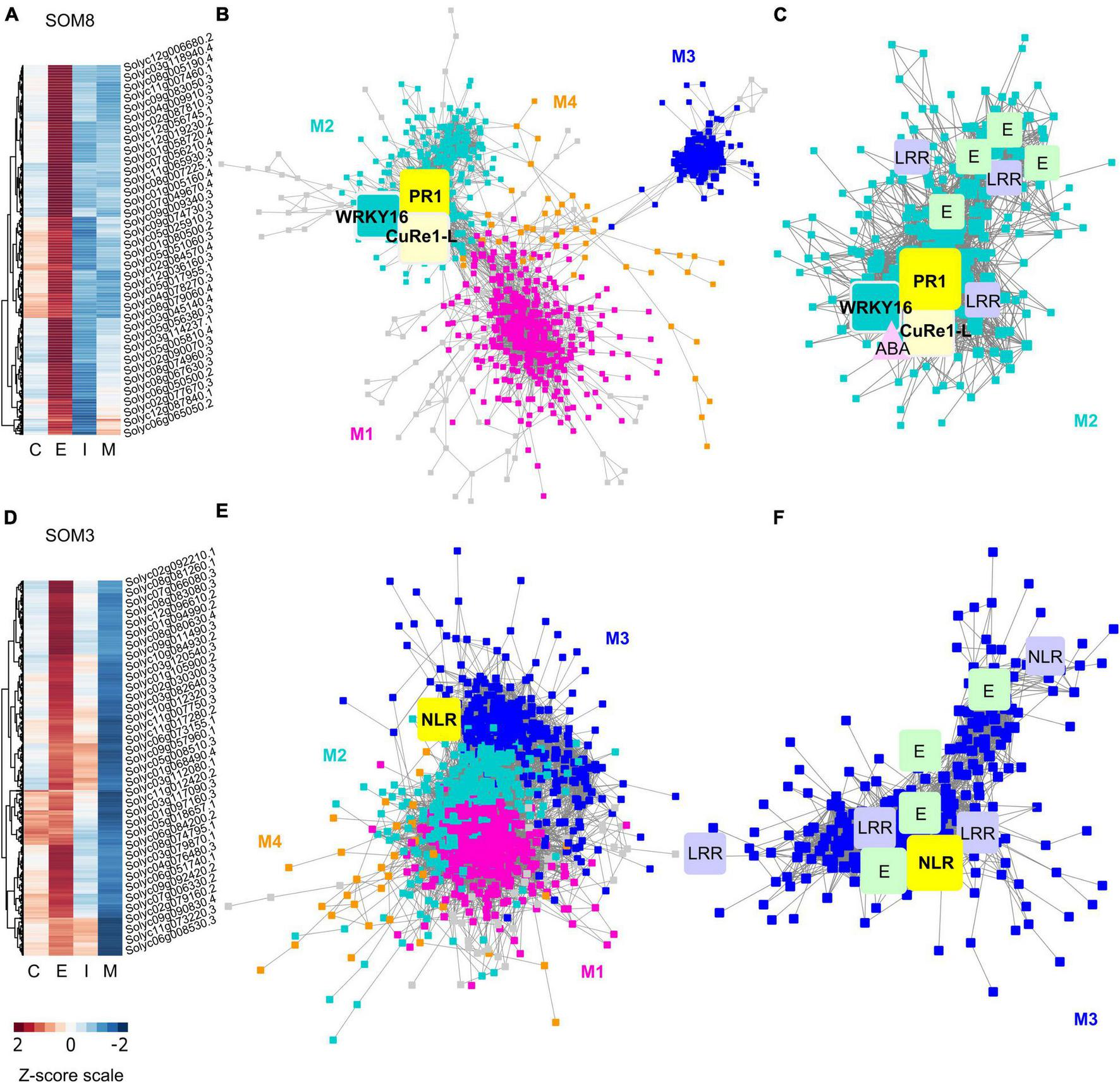 Heatmaps and gene-coexpression networks (GCNs) of LCM RNA-Seq data from the host tomato tissues surrounding C. campestris haustoria. (A) A heatmap of gene expression profiles in z-scores for SOM8, which includes genes specifically highly expressed in the early stage. (B) A GCN of genes in SOM8. This SOM8 GCN is composed of four major modules. Cyan indicates genes in Module 2. The transcription factor WRKY16 is enlarged and labeled in cyan as other genes in Module 2. PR1 is enlarged and labeled in yellow. CuRe1-like receptor (CuRe1-L) is enlarged and labeled in light yellow. (C) GCN of genes that are classified in SOM8 Module 2. CuRe1-L, CuRe1-like receptor. LRR, Leucine-rich repeat receptor-like protein kinase. ABA, Abscisic acid stress ripening 5. E, ethylene-responsive transcription factor. (D) A heatmap of gene expression profiles in z-scores for SOM3, including genes that have high expression levels in the early stage and moderate expression levels in the intermediate stage. (E) A GCN of genes in SOM3. This SOM3 GCN is composed of four major modules. Blue indicates genes in Module 3. NBS is enlarged and labeled in yellow. (F) GCN of genes that are classified in SOM3 Module 3. LRR, Leucine-rich repeat receptor-like protein kinase. E, ethylene-responsive transcription factor. NLR, NBS-LRR protein. The complete gene lists for all SOM units with SOM distances and PCA principal component values are included in Supplementary Table 6. The selected SOM gene lists were used for constructing the GCN based on the expression profiles in tomato LCM data with the following normal quantile cutoffs. The SOM8 GCN cutoff = 0.90. The SOM3 GCN cutoff = 0.80.