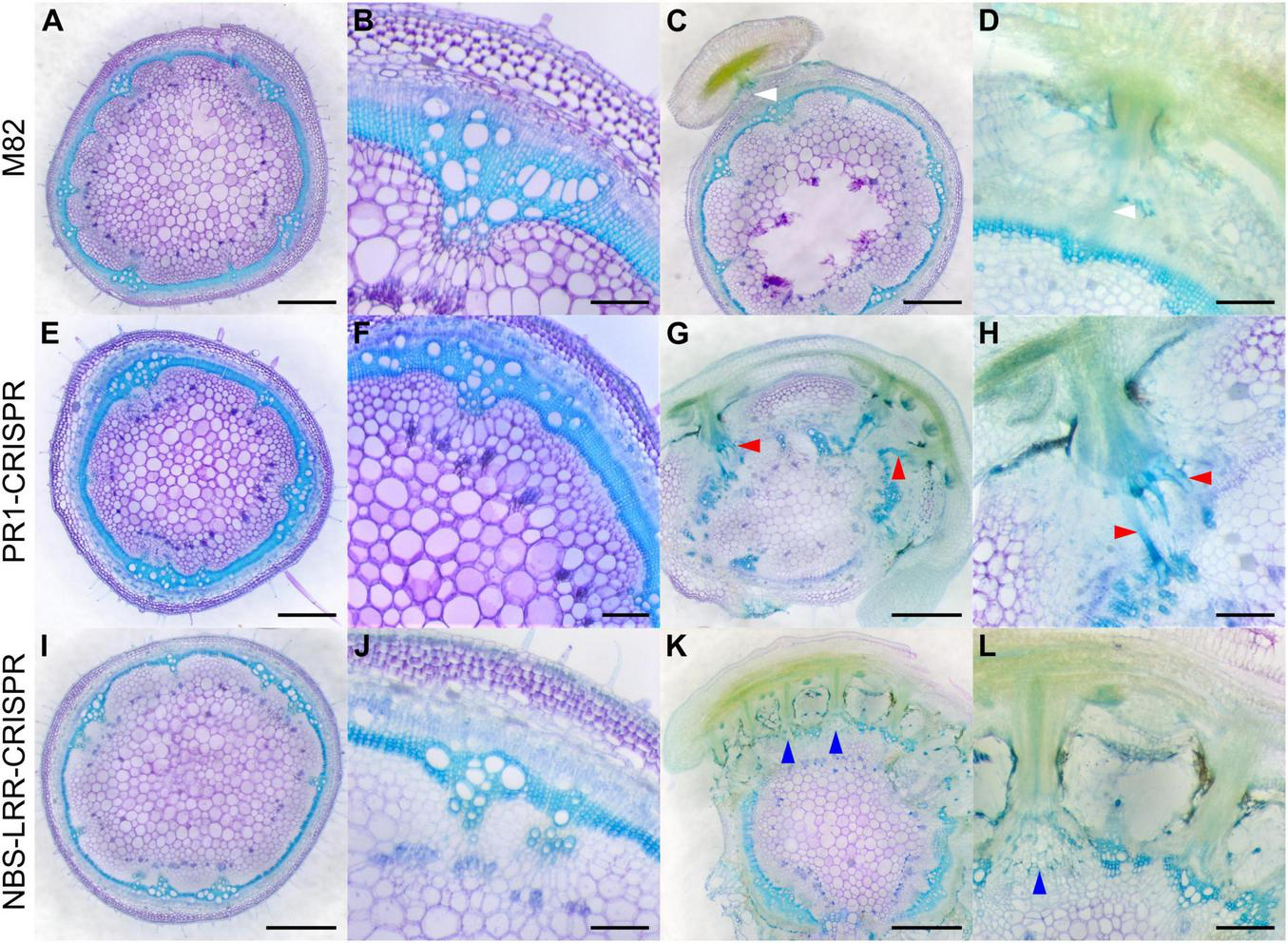 Haustorium phenotypes of C. campestris growing on M82 tomato wild-types and candidate genes-CRISPR transgenic plants. C. campestris haustoria that were growing on wild-type M82 tomato hosts (A–D), on PR1-CRISPR T1 transgenic tomato plants (E–H), on NBS-LRR-CRISPR T1 transgenic tomato plants (I–L). (G–H) Vibratome sections of C. campestris growing on PR1-CRISPR T1 plant #6. (K,L) Vibratome sections of C. campestris growing on NBS-LRR-CRISPR T1 plant #4. (A,C,E,G,I,K) Scale bars = 1 mm. (B,D,F,H,J,L) Scale bars = 200 μm. (A–L) 100 μm thick vibratome sections of fresh haustorium stained with Toluidine Blue O. White arrowhead indicates normal haustorial vascular connections. Red arrowhead indicates the hypertrophy symptom with enlarged xylem bridges. Blue arrowhead indicates the phenotype of disrupted host stem vascular tissue arrangement.