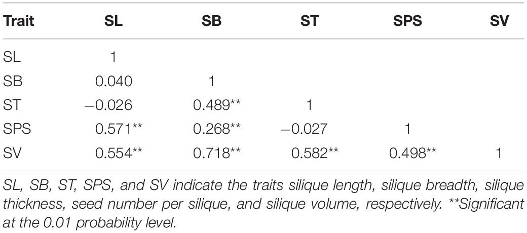 The correlation coefficients among the five silique-related traits were calculated (Table 2), and most were extremely significantly correlated with each other. For instance, highly significant positive correlations were observed between SV and the other four silique-related traits, SB was significantly positively correlated with ST, SPS and SV, and SPS showed significant positive correlations with the other silique-related traits, except for ST. Studying the associations among SL, SB, ST, SPS, and SV is of great significance to understand silique morphogenesis and increase rapeseed yield.
