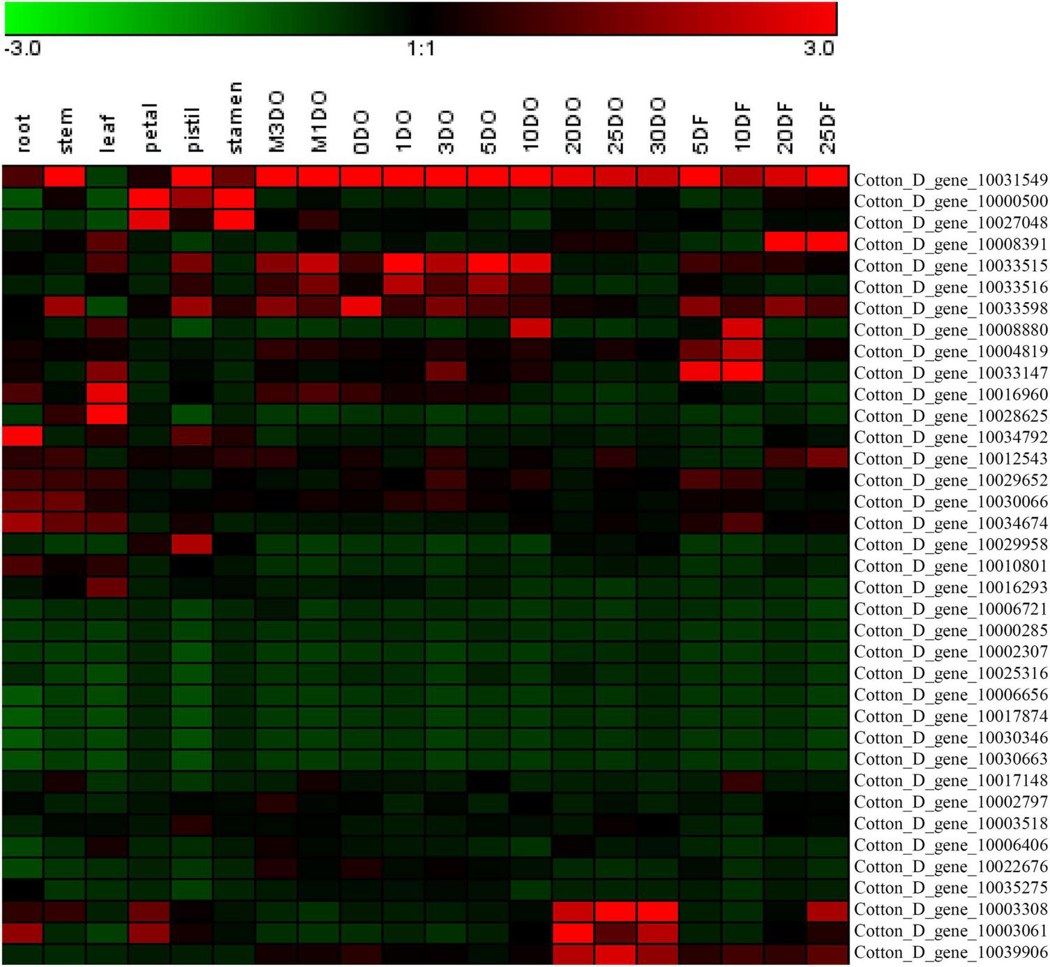 Heat map representation for expression patterns of Gossypium raimondii TCP genes in 20 representative tissues. The heat map, generated with Genesis, shows the hierarchical clustering of GrTCPs in root, stem, leaf, petal, pistil, stamen, ovule and fiber tissues. M3DO, M1DO, 0DO, 1DO, and 3DO: ovules attached with fibers at -3, -1, 0, 1, and 3 days post-anthesis; 5DO, 10DO, 20DO, 25DO, and 30DO: ovules without fibers at 5, 10, 20, 25, and 30 days post-anthesis; 5DF, 10DF, 20DF, and 25DF: fibers at 5, 10, 20, and 25 days post-anthesis. The reads per kilobase of transcript per million mapped reads values were log10 transformed and indicated the expression level of GrTCPs genes, while the gradient color (red/black/green) reflects the expression levels (high to low).