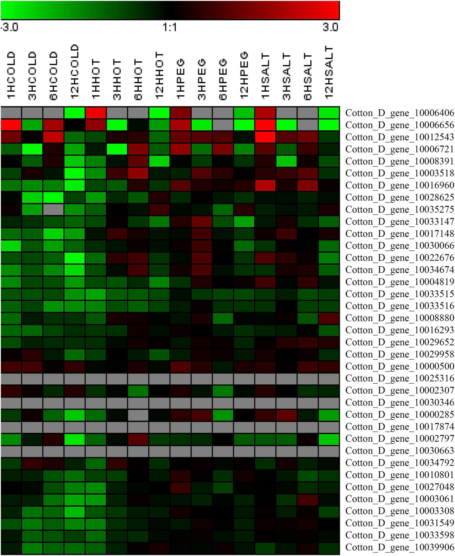 Heat map representation for expression patterns of Gossypium raimondii TCP genes in cotton leaves under abiotic stress. The heat map, generated with Genesis, shows the hierarchical clustering of GrTCPs in response to cold (4°C), hot (37°C), drought (20% PEG) and salt (200 mM NaCl) stress, respectively. 1HCOLD, 3HCOLD, 6HCOLD, and 12HCOLD: cold treatment for 1, 3, 6 and 12 h; 1HHOT, 3HHOT, 6HHOT, and 12HHOT: hot treatment for 1, 3, 6, and 12 h; 1HPEG, 3HPEG, 6HPEG, and 12HPEG: drought treatment for 1, 3, 6, and 12 h; 1HSALT, 3HSALT, 6HSALT, and 12HSALT: drought treatment for 1, 3, 6, and 12 h. The reads per kilobase of transcript per million mapped reads values were log10 transformed and indicated the expression level of GrTCPs genes, while the gradient color (red/black/green) reflects the expression levels (high to low).