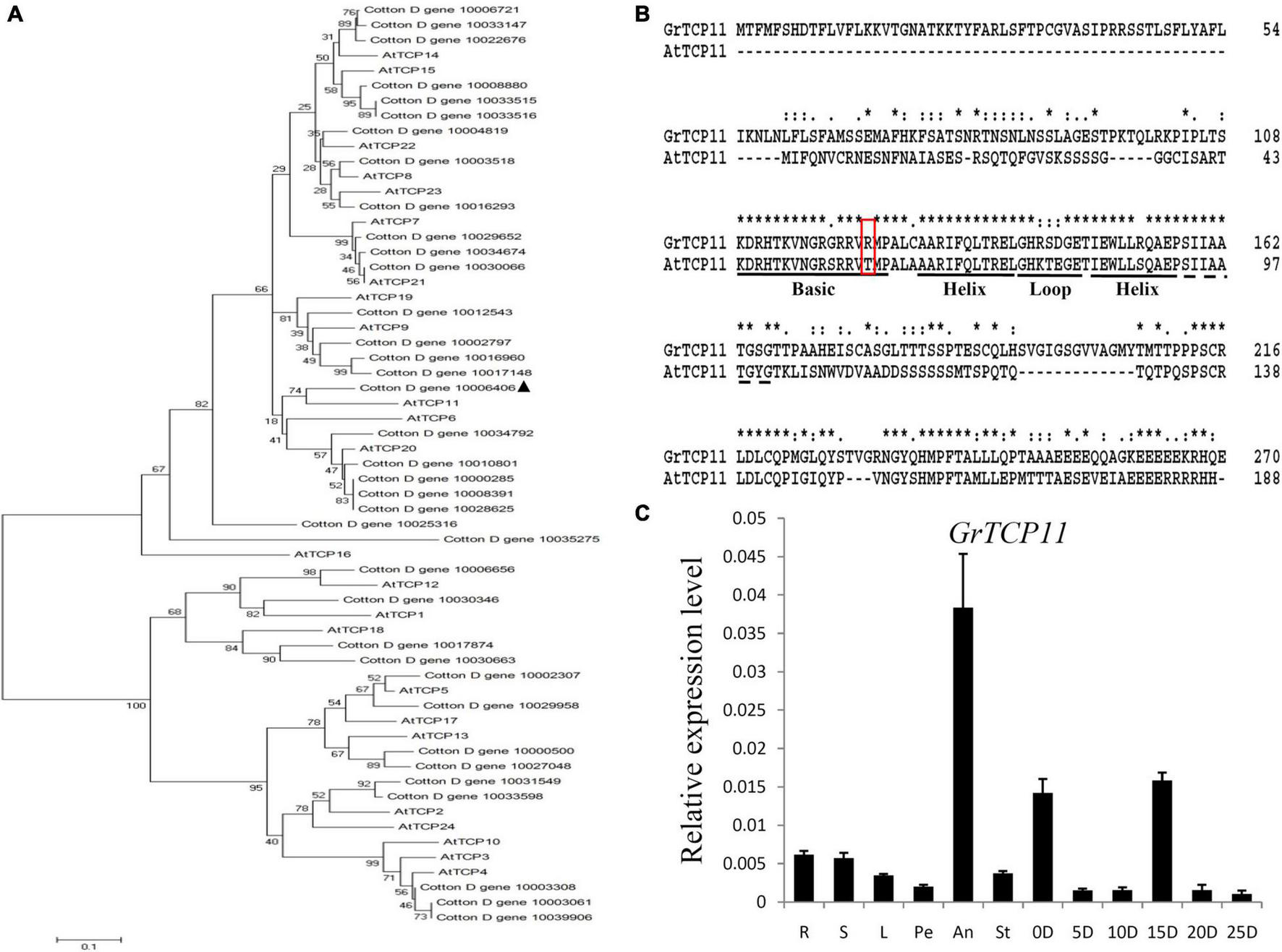 Phylogenetic analysis, sequence alignment and expression analysis of GrTCP11. (A) Phylogenetic relationships of TCP transcription factors from Gossypium raimondii and Arabidopsis. The unrooted phylogenetic tree was constructed using MEGA 6.0 with the neighbor-joining method and the bootstrap test involved 1000 iterations. GrTCP11 is marked with a solid triangle. (B) Alignment of the amino acid sequences of GrTCP11 and AtTCP15. The horizontal lines indicate the conserved teosinte branched1/cycloidea/proliferating cell factor1 (TCP) domain. The red box indicates the amino acid residue at position 15 of the TCP protein domain. (C) Relative expression level of GrTCP11 in various tissues, including root (R), stem (S), leaf (L), petal (Pe), anther (An), stigma (St) and fibers (0D and 5D: ovules with fibers at 0 and 5 days post-anthesis; 10D, 15D, 20D, and 25 D: fibers at 10, 15, 20, and 25 days post-anthesis) from Gossypium hirsutum cv.TM-1; expression of GrTCP11 was calculated relative to GhUB7 expression. Error bar on each mean value represents the standard deviation of three biological replicates.