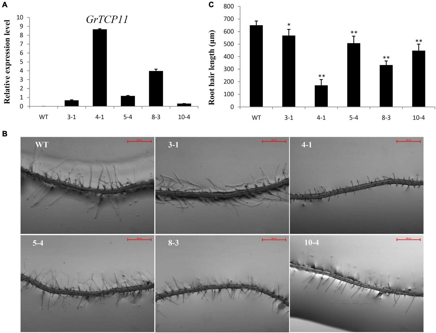 Expression level and morphological alterations of the root hairs in Arabidopsis transgenic plants overexpressing GrTCP11. (A) Relative expression level of GrTCP11 in transgenic lines (3-1, 4-1, 5-4, 8-3, and 10-4) and wild-type plants; expression of GrTCP11 was calculated relative to reference AtACT2 expression; error bars represent the standard deviation of three biological replicates. (B) Root hairs in the mature area of taproots of 7-day-old transgenic lines and wild-type plants; scale bars = 500 μm. (C) Length of the root hairs of 7-day-old seedlings within the mature zone; data are mean of 100 root hairs; *P < 0.05; **P < 0.01 relative to the wild-type, using Student’s t test.