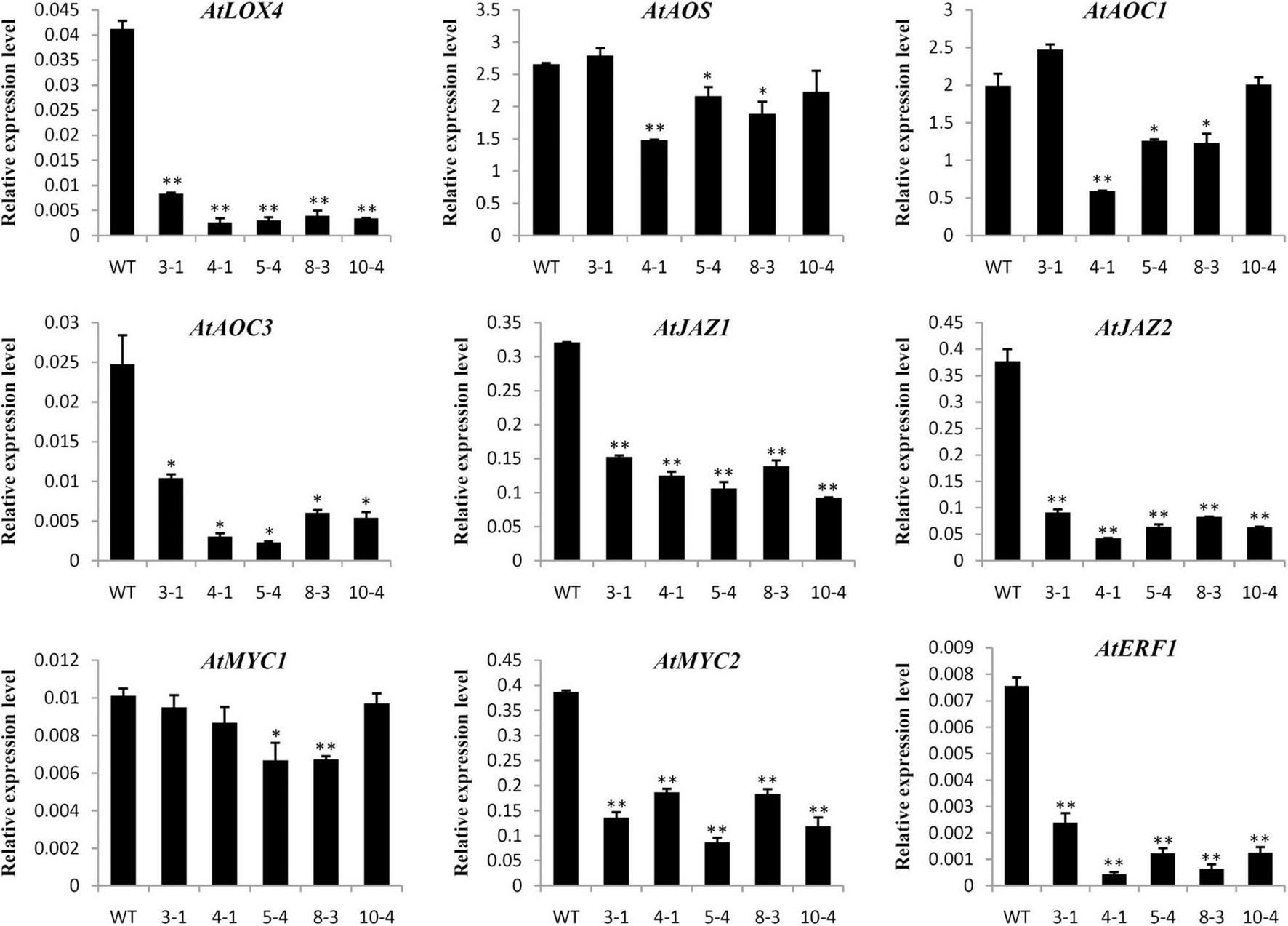 Relative expression level of the genes related to JA biosynthesis and response in wild-type and GrTCP11-overexpressed transgenic lines (3-1, 4-1, 5-4, 8-3, and 10-4). The accession numbers of the genes are as follows: AtLOX4, AT1G72520; AtAOS, AT5G42650; AtAOC1, AT3G25760; AtAOC3, AT3G25780; AtJAZ1, AT1G19180; AtJAZ2, AT1G74950; AtMYC1, AT4G00480; AtMYC2, AT1G32640; AtERF1, AT3G23240. Gene expression values are relative to reference AtACT2 expression; error bars represent the standard deviation of three biological replicates. Asterisks indicate a significant difference (*P < 0.05; **P < 0.01) relative to the corresponding wild-type, using Student’s t test.