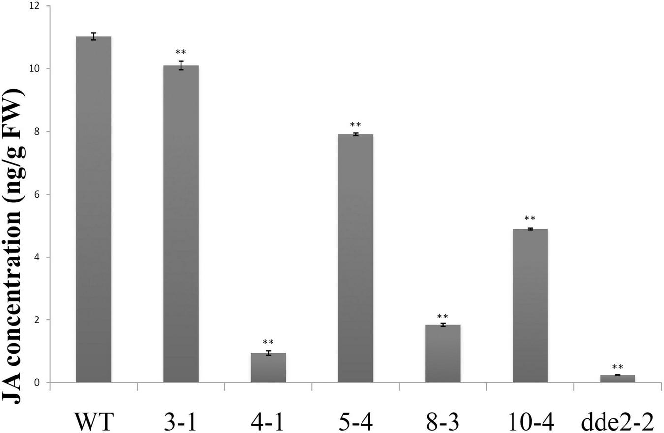 JA concentration in wild-type, GrTCP11-overexpressed lines (3-1, 4-1, 5-4, 8-3, and 10-4) and the JA-insensitive mutant dde2-2. Three independent experiments were performed; error bars represent the standard deviation. Significant differences between the wild-type and other lines were calculated by Student’s t-test analysis (**P < 0.01).