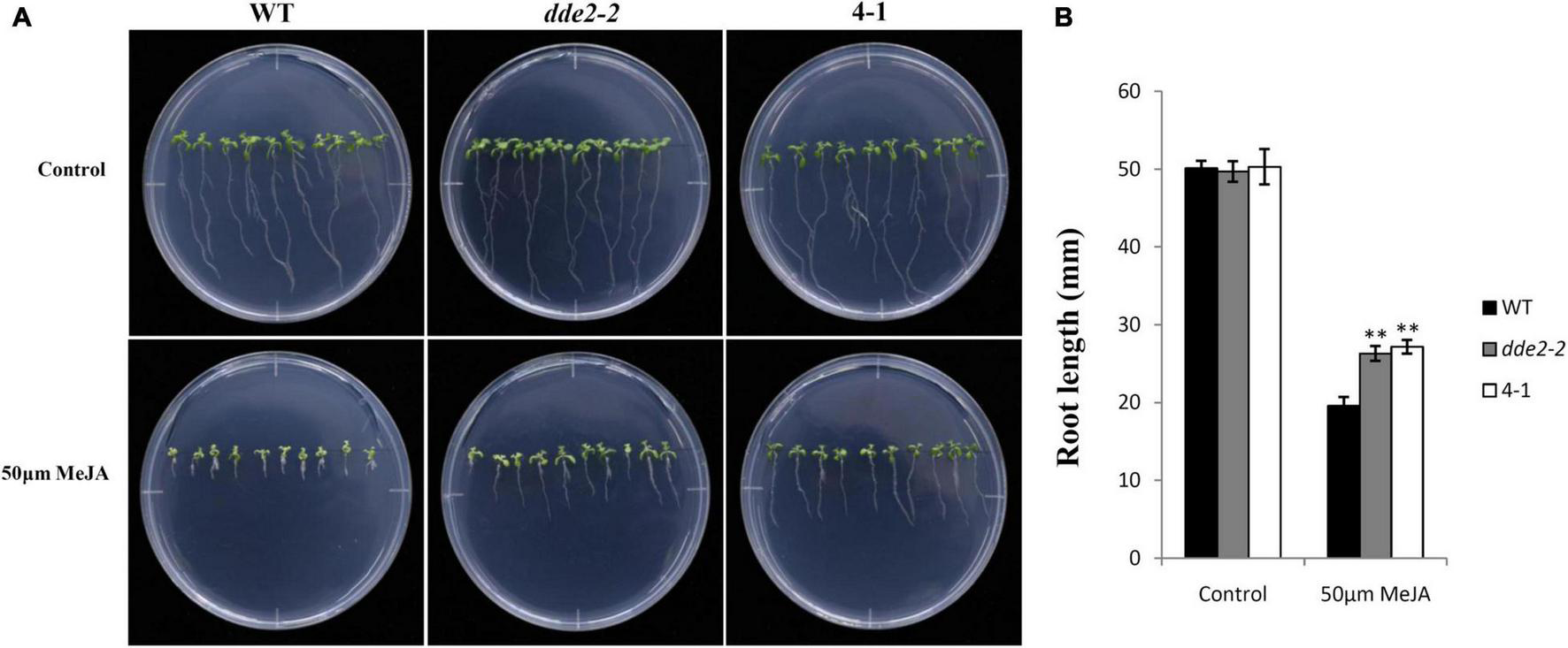 Sensitivity analysis of wild-type, transgenic line 4-1 and JA-insensitive mutant dde2-2 in response to methyl jasmonate (MeJA). (A) 12-day-old seedlings were grown on agar plates supplemented with (50 μM MeJA) or without (Control) MeJA. (B) Measurement of the root length in wild-type, 4-1 and dde2-2 grown for 12 days on agar plates held upright and containing or not containing 50 μM MeJA. Data are mean of at least 20 roots; error bars represent the standard deviation of 20 biological replicates; **P < 0.01 relative to the wild-type, using Student’s t test.