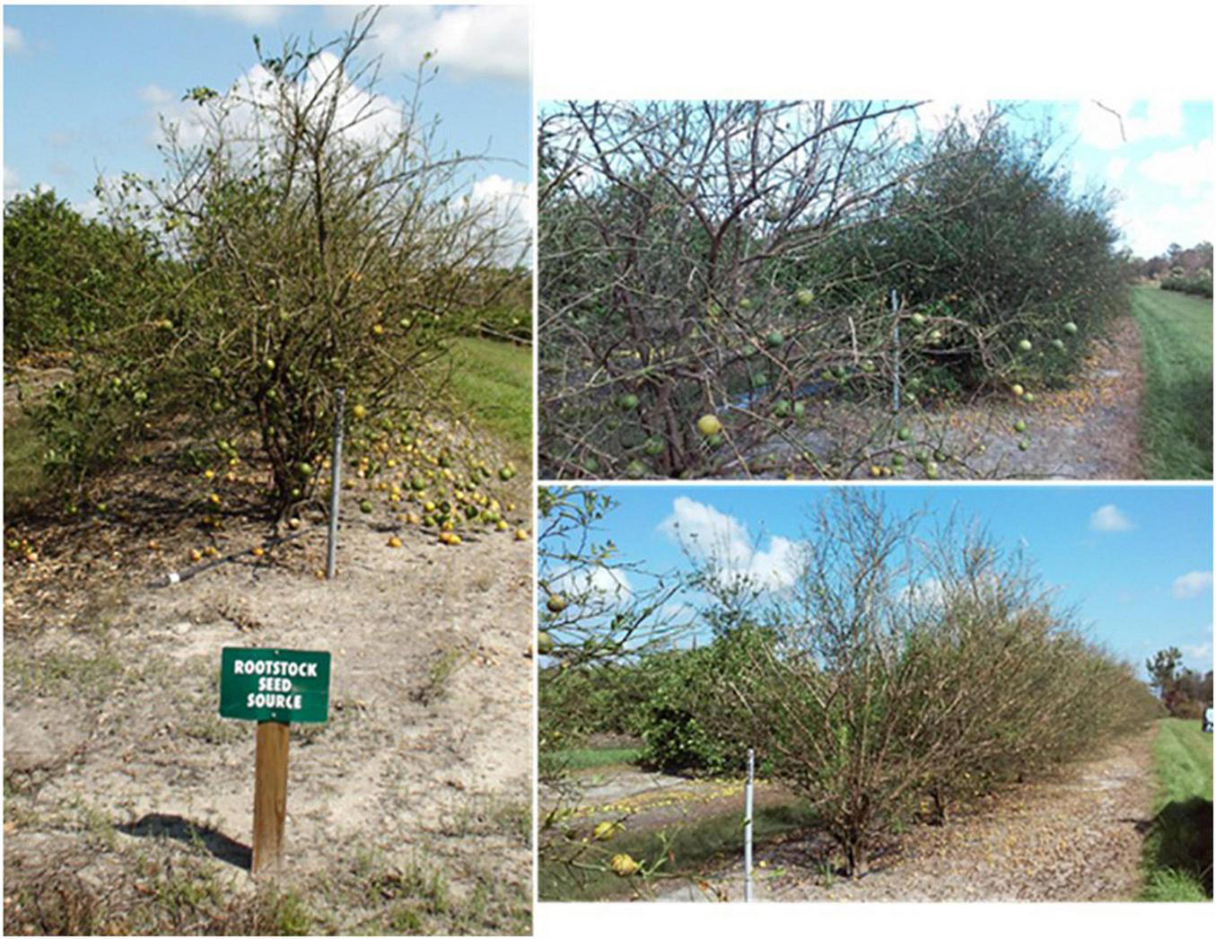 The rootstock seed source plantings at UF-IFAS Southwest Florida Research and Education Center in the aftermath of Hurricane Irma on September 14th, 2017. Note how virtually all rootstock seed-producing fruit from US-802, US-897, and US-942 was lost (Adapted from Alferez et al., 2021a).