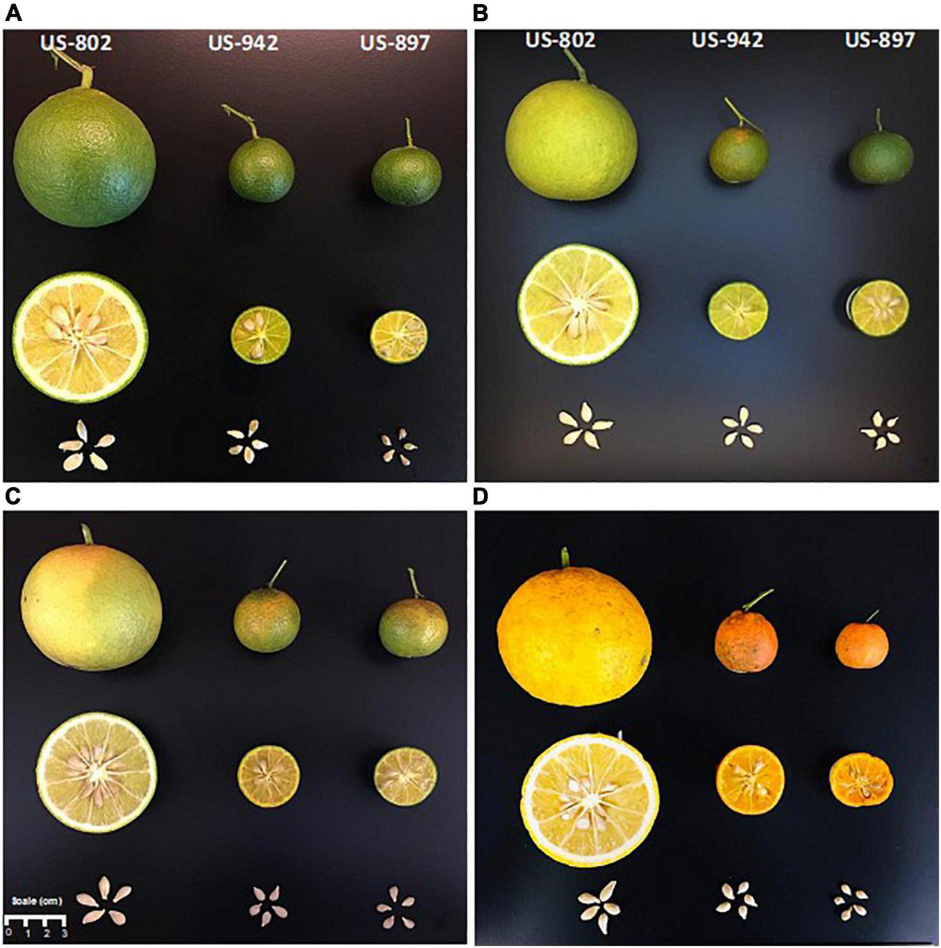Significant interaction between rootstock and time of harvest was observed for fruits and seeds (Tables 2, 3). In all three rootstocks studied growth pattern was similar, and typically sigmoidal, as described elsewhere for citrus (Agustí and Primo-Millo, 2020). In September 2020, fruits had the highest weight and size. These values were similar or even higher than those observed in December 2019 when the fruits were fully mature (Table 2). The characteristics of the fruits may vary with the cropping season, due to biotic and abiotic factors, such as HLB (Rosales and Burns, 2011) or water stress (Garcia-Tejero et al., 2011), and may also depend on the fruit loading (Iglesias et al., 2007; Agustí and Primo-Millo, 2020). Fruits from US-802 were larger than those from US-897 and US-942, and had the highest number of seeds per fruit (33–50), depending on the season (Table 3). Number of seeds was different depending on the rootstock variety and fruit size, as previously reported (Alferez and Bordas, 2019). The number of seeds per fruit is one of the major factors for citrus rootstock selection. Citrus rootstocks that produce large number of seeds per fruit and good seedling emergence performance are preferred by the nurseries (Bisi et al., 2020); however, it is worth noting that US-942, one of the rootstocks currently most favored by citrus growers in Florida due to its superior performance under HLB conditions, produces significantly less seeds (Table 3). This adds an additional challenge to the citrus industry.