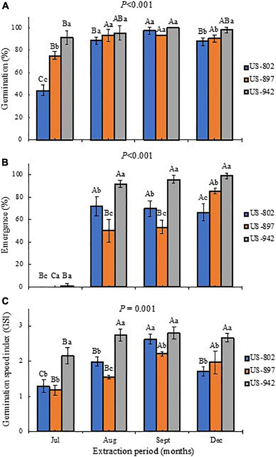 | US-942 | 33.7 ± 0.49 Bb | 36.1 ± 0.57 Bb | 40.6 ± 1.08 Ab | 41.3 ± 2.14 Ab |