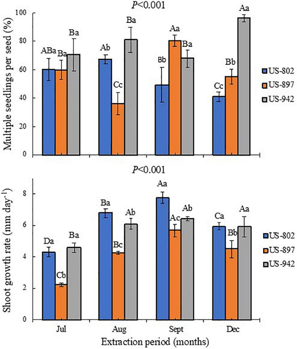 Seeds from all three rootstocks were individually peeled, standardized for the moisture content for 24 h under controlled-environment conditions (10°C, 100% RH, and dark), surface-sterilized for 20 min in a solution with 5.0% (v/v) sodium hypochlorite (Clorox Co., Oakland, CA, United States) and 0.01% (v/v) Tween 20 (Sigma-Aldrich, St. Louis, MO, United States), rinsed three times in distilled sterile water, and then sown. The germination test was performed in vitro in a complete randomized design using four replicates of 15 peeled seeds extracted from a 50-fruit sample for each harvest date and rootstock, as previously described. One sterile seed was individually placed per culture tube (25 × 150 mm) filled with 18 mL of MS (Murashige and Skoog, 1962) basal medium supplemented with 3% sucrose (w/v) and 0.7% agar (w/v) (Murashige and Skoog Basal Medium, M9274, Sigma-Aldrich, St. Louis, MO, United States), previously adjusted to pH of 5.8 and autoclaved at 121°C for 15 min. After sown, the culture tubes were sealed and maintained in growth chamber (Conviron Ltd., CMP6010, Winnipeg, MB, Canada) at constant temperature of 25 ± 1°C and dark for 30 days. Measurements were taken daily after root protrusion in order to calculate the total percentage of germination, root growth rate (RGR), shoot growth rate (SGR), and germination speed index (GSI) (germination rate) that measures the speed of germination and quantifies the seed vigor based on a time-weighted cumulative germination (Brown and Mayer, 1986). The percentage of multiple seedlings per seed (polyembryony) was quantified at the end of the germination evaluation. To calculate the root and SGR we used the following formula: