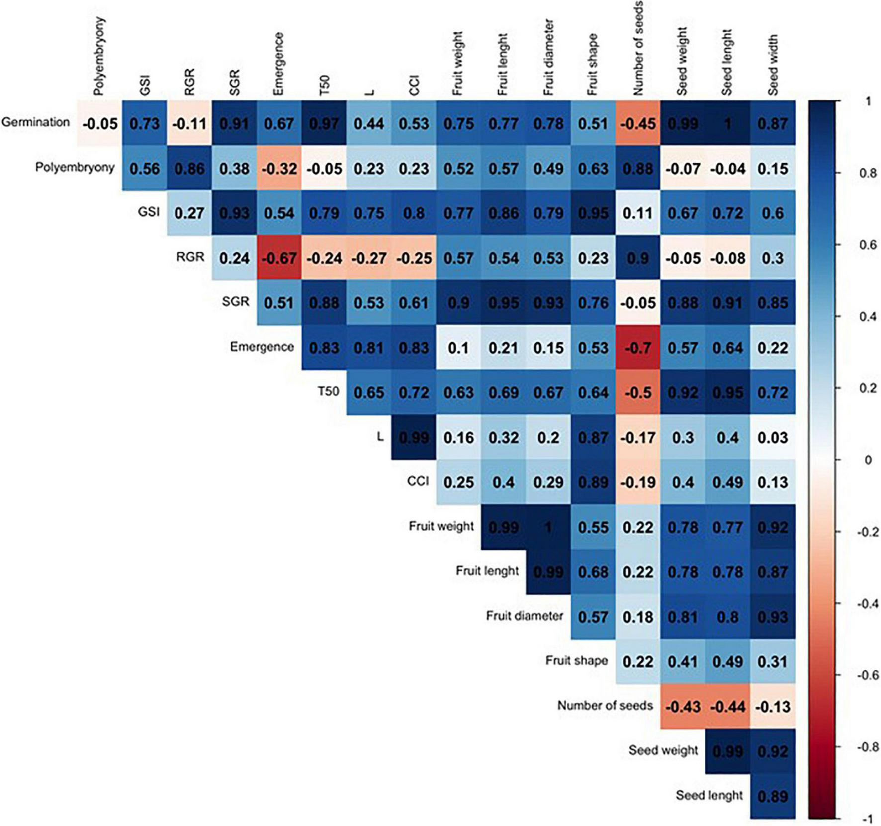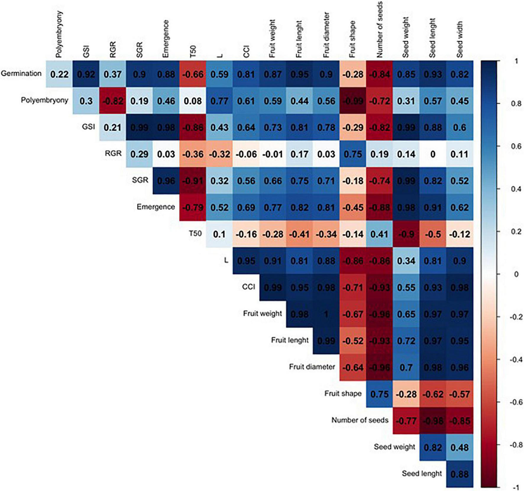 The experimental design was completely randomized with a factorial arrangement [three treatments (rootstocks) × four seed extraction periods] replicated four times. The fruit characterization was performed using 10-fruit sample per replicate while 100-seed sample was taken per replicate for seed characterization. The evaluation of seed germination was based on 15-seed sample per replicate and 48-seed sample for the seedling emergence test. These data were submitted to normality and homogeneity of variances tests before analysis of variance (ANOVA) using the ExpDes package (Husson et al., 2017) in R v. 4.0.2 (The R Foundation for Statistical Computing, Vienna, Austria). Means were compared by Tukey’s test and taken to be significantly different at P ≤ 0.05. The correlation matrices were created for each citrus rootstocks based on the studied traits using the FactoMineR (Lê et al., 2008) and corrplot (Wei et al., 2017) R packages. Fruit abscission data from in vitro assays was expressed as mean ± std and was subjected to analysis of variance for means separation.