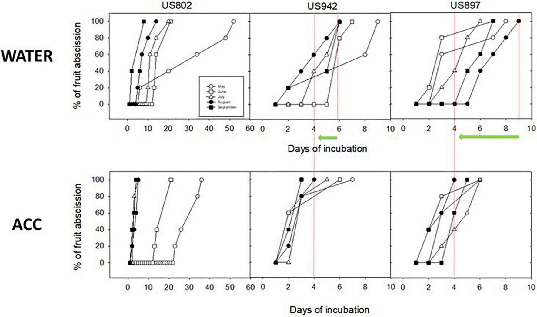 Additionally, four replicates of 10 fruits per rootstock and treatment, containing the stem (2 cm), were harvested at each harvest date and immediately transported to the lab. A disposable plastic 3 mL Pasteur pipette was attached to the stem and the union sealed with parafilm to prevent leakage. Treatment solutions were applied through the pipette by cutting the upper portion of the pipette. Treatments were water (control) and 1-aminocyclopropane-l-carboxylic acid (ACC; 0.1 mM), as previously described (Merelo et al., 2017). Abscission rate was monitored daily.