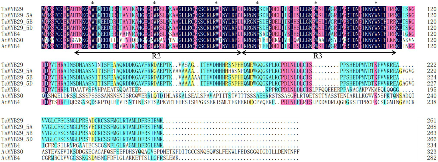 Figure 1. Alignment of the amino acid sequence of TaMYB29 with its homologous sequences. The sequences were aligned with DNAMAN. The identical residues are shaded. The black arrow line shows the MYB-binding domain. The asterisks (∗) show typical R2R3-MYB protein contains three regularly spaced tryptophan (W) residues and the first tryptophan residue was replaced by phenylalanine (F) in the R3 repeats.