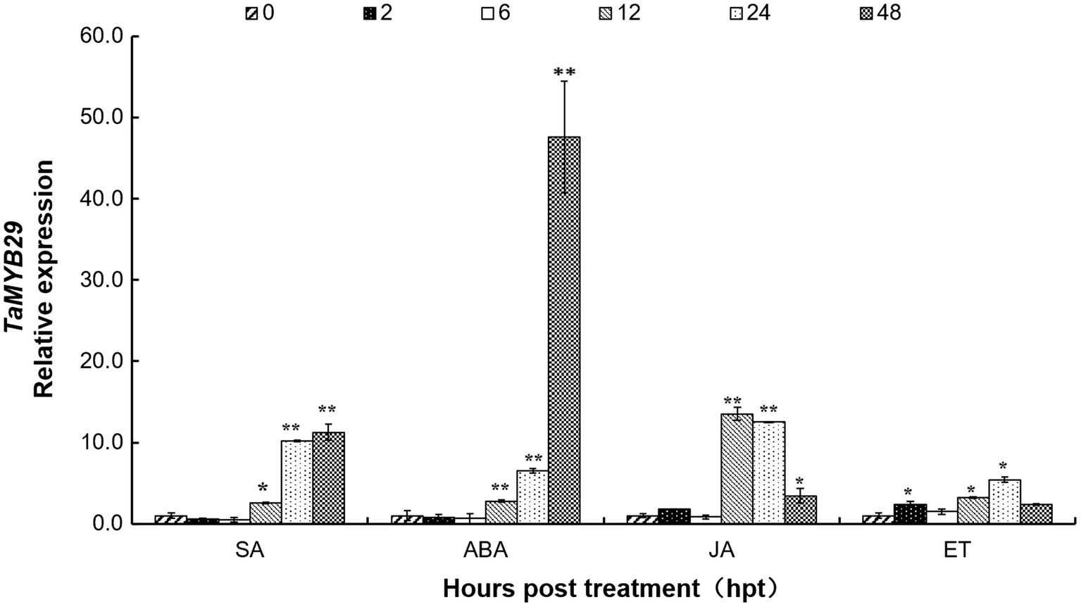 Figure 4. The expression profiles of TaMYB29 in AvS+Yr10 wheat leaves in response to exogenous hormones. The wheat leaves were sprayed with SA (salicylic acid), ABA (abscisic acid), JA (methyl jasmonate), and ET (ethylene), respectively and were sampled at 0, 2, 6, 12, 24, and 48h post-treatment (hpt). Three independent biological replications were performed. Error bars represent standard deviation among three biological replications. Student’s t-tests were used for the statistical analyses and the asterisks (∗) and (∗∗) indicate a significant difference between that time point and 0hpt with a value of p<0.05 and 0.01, respectively.