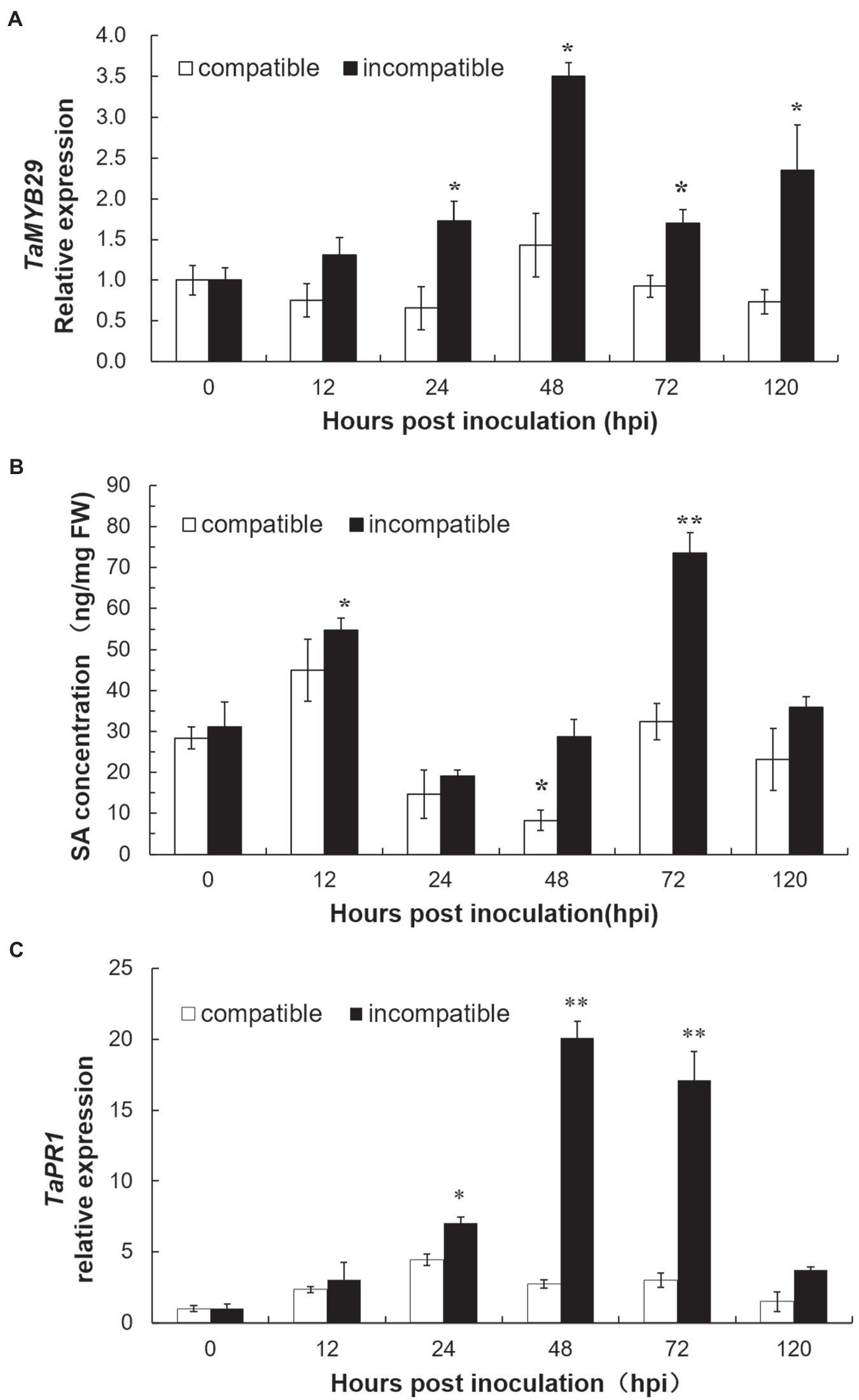 We measured the endogenous levels of SA in both compatible and incompatible interactions at six time points (Figure 5B). In the incompatible interaction, the first significant increase in the SA levels appeared at 12 hpi, earlier than the TaMYB29 expression, and subsequently reduced at 24 and 48hpi, contrary to the observation in the TaMYB29 expression compared with the 0hpi control. The highest SA levels were obtained at 72hpi. Next, the SA levels rapidly returned to the basal levels at 120hpi. The SA levels in the compatible interaction presented a similar trend as in the incompatible system although the levels were lower than those in the incompatible system at every time point.