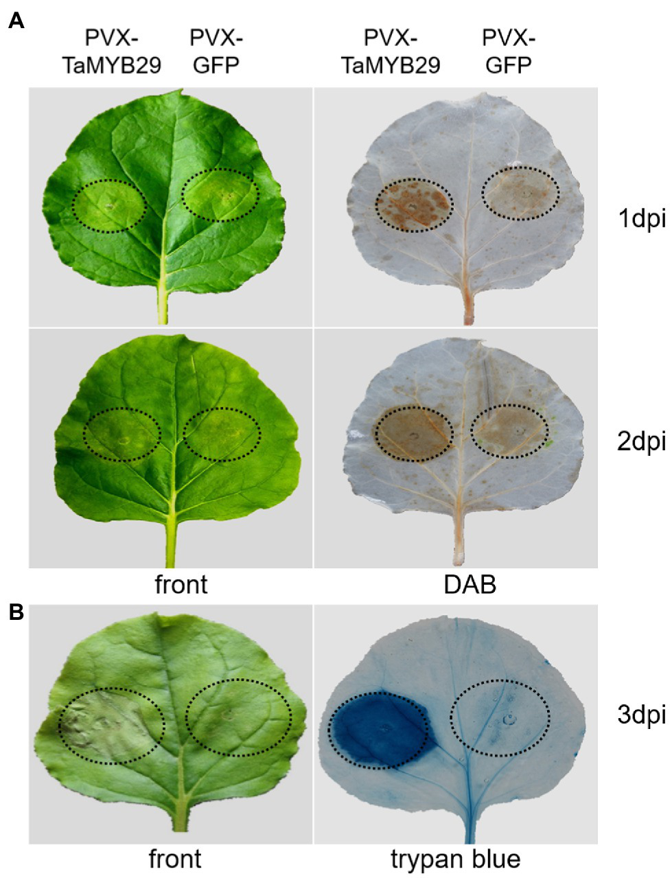 Figure 6. Expression of TaMYB29-induced ROS accumulation and pathogen-independent cell death in N. benthamiana leaves. (A) Symptoms of N. benthamiana leaf areas expressing TaMYB29 or GFP gene from 1 to 2days post-infiltration (dpi). The left and right panels represent the front and after DAB staining, respectively. (B) Symptoms of N. benthamiana leaf areas expressing TaMYB29 or GFP gene at 3 dpi. The left and right panels represent the front and after trypan blue staining, respectively. These experiments were repeated at least three times and got the same result.