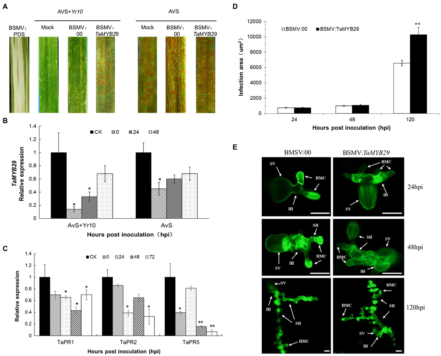 Figure 7. Functional analysis of the TaMYB29 gene by the BSMV-VIGS assay. (A) Infection type of AvS and AvS+Yr10 wheat leaves to CYR32 after inoculated with BSMV:00 or BSMV:TaMYB29. Stripe rust was inoculated 9days post-BSMV inoculation. Pictures were taken 15days post-rust inoculation. Mock: wheat leaves inoculated with FES buffer. BSMV:00 means only the BSMV genome; BSMV: TaMYB29 means a 183-bp fragment of TaMYB29 was inserted into the BSMV:γ genome. Photobleaching was evident on the leaves infected with BSMV:PDS but not on the mock-inoculated leaves. (B) Transcriptional level of TaMYB29 in AvS and AvS+Yr10 during the course of Pst infection at 0, 24, and 48hpi. CK: wheat leaves treated with BSMV:00. (C) Transcriptional level of pathogenesis-related gene TaPR1, TaPR2, and TaPR5 in TaMYB29 silenced AvS+Yr10 wheat leaves after inoculated with Pst. Leaves were sampled at 0, 24 48, and 72hpi. Three independent biological replications were performed. Error bars represent standard deviation among three biological replicates. Student’s t-tests were used for the statistical analyses and the asterisks (∗) and (∗∗) indicate a significant difference between that time point and 0hpi with a value of p<0.05 and 0.01, respectively. (D,E) Infection area (D) and hyphae development of Pst (E) in TaMYB29 knockdown AvS+Yr10 wheat leaves after infected with CYR32. Wheat leaves were sampled at 24, 48, and 120hpi and observed microscopically after stained with WGA. SV, substomatal vesicle; IH, initial hyphae; HMC, haustorial mother cell; and SH, secondary hyphae. Bars=20μm.