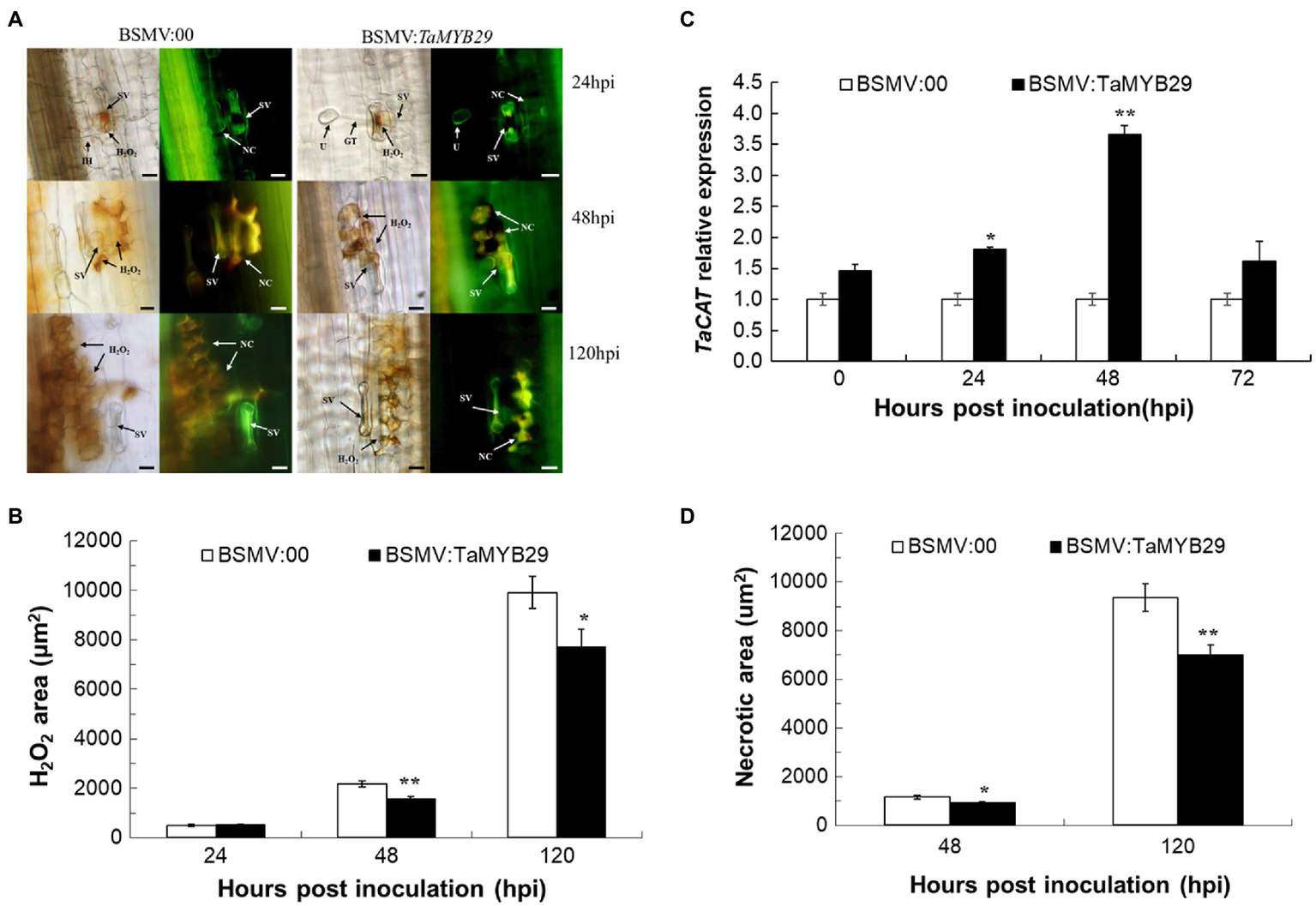 Figure 8. Reactive oxygen accumulation and related gene expression and hypersensitive response in the TaMYB29 knockdown AvS+Yr10 wheat leaves. (A) The reactive oxygen species and cell necrosis in wheat leaves in response to Pst observed under a fluorescence microscope. (B) The reactive oxygen species areas were stained with DAB and measured microscopically at 24, 48, and 120hpi. H2O2 accumulation was significantly reduced in TaMYB29 silenced leaves compared to the control. (C) Transcriptional level of ROS-related gene TaCAT in AvS+Yr10 after TaMYB29-scilencing at four time points relative to the expression in BSMV:00. (D) Cell death was measured microscopically because of the auto-fluorescence of necrotic cells at 48 and 120hpi. The area of green auto-fluorescence reduced in TaMYB29-silenced wheat plant. Pictures were taken under an epifluorescence or light microscopy at 24, 48, and 120hpi, respectively. BSMV:00 is the control group and BSMV:TaMYB29 is the experimental group in which TaMYB29 gene was silenced. U, urediniospore; GT, germ tube; NC, necrotic cell; SV, substomatal vesicle; IH, initial hyphae; HMC, haustorial mother cell; and SH, secondary hyphae. Bars=20μm. Error bars represent standard deviation among three biological replications. Student’s t-tests were used to for the statistical analyses and the asterisks (∗) and (∗∗) indicate a significant difference between particular hpi and controls with a value of p<0.05 and 0.01, respectively.