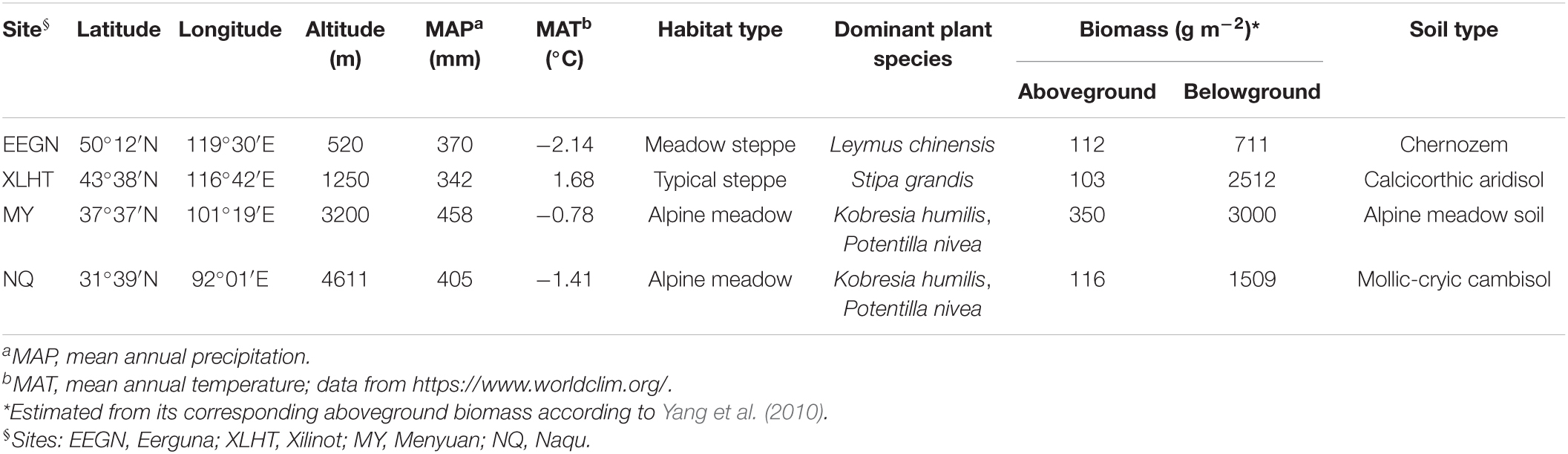 Four study sites with three representative grassland habitat types were located in the transition zone along 400 mm isohyet from the meadow steppe, typical steppe to the alpine meadow (Figure 1). Two sites were located on the Inner Mongolian Plateau, with meadow steppe dominated by Leymus chinensis in Eerguna [called EEGN at 520 m average sea level (a.s.l.)] and the other was typical steppe dominated by Stipa grandis in Xilinhot (called XLHT at 1250 m a.s.l.). The other two sites, namely Menyuan (MY, 3200 m a.s.l.) and Naqu (NQ, 4611 m a.s.l.), were located on the Qinghai-Tibet Plateau with the alpine meadow dominated by Kobresia humilis and Potentilla nivea. The aboveground biomass in the EEGN, XLHT, MY, and NQ sites was 112, 103, 350, and 116 g m–2, respectively; belowground biomass was 711, 2512, 3000, and 1509 g m–2, respectively (Table 1). According to the root distribution characteristics of plants, we collected soil samples from a depth of 0–10 cm (topsoil) and 30–40 cm (subsoil) at each study site in the plant growing season in September 2016. At each study site, five 1 m × 1 m subplots were established, one at each corner and one in the center of a 10 m × 10 m plot. The soil samples collected from the same layer at each plot were mixed into single composite samples, which were passed through 2 mm sieves and removed root materials. In total, 24 sieved soils (4 study sites × 3 replicates × 2 soil depths) were processed and stored as appropriate for physicochemical, biological, and molecular analyses.