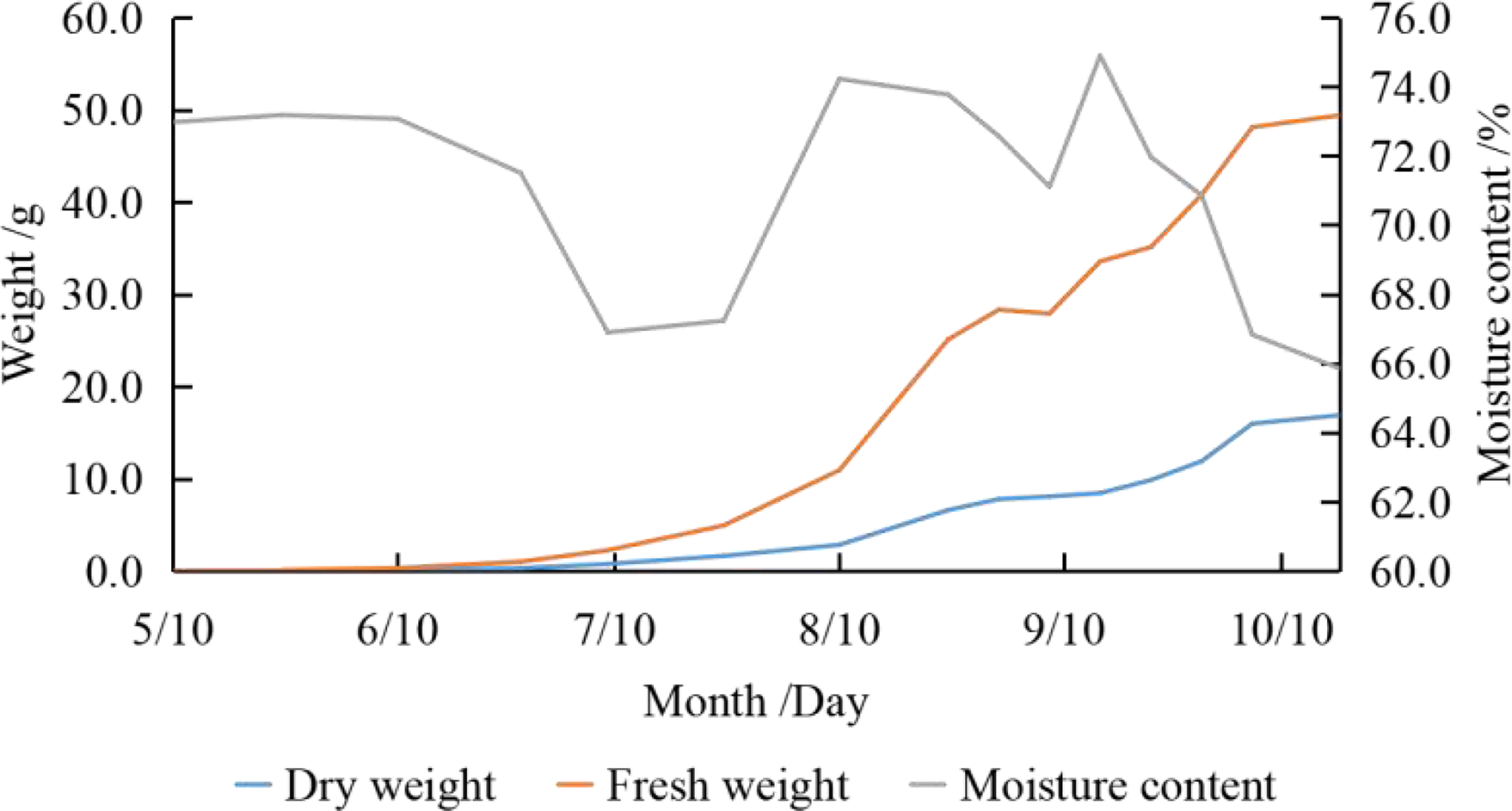 Moisture is a large proportion of the fresh mass. The trend of water content was “down - up - down” (66.85% to 74.90%), with high levels in mid-May, mid-August and mid-September, and low levels in early July and the end of the fruit developing period.