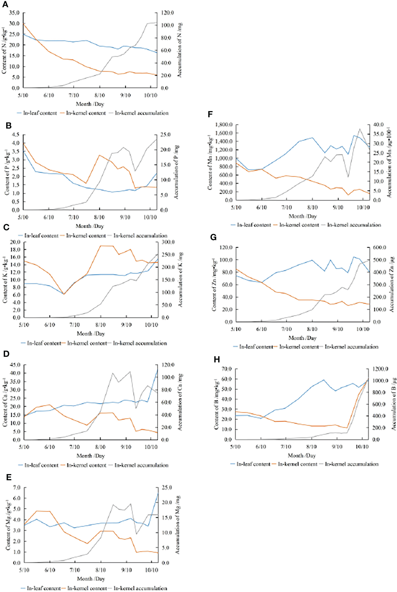 There are significant phenological characteristics of mineral nutrients in fruit trees (Cruz et al., 2019), which have been demonstrated in apple, peach, citrus, olive, kiwi and walnut species (Clark and Boldingh, 1992; Kim and Wetzstein, 2005; Stateras and Moustakas, 2018). In some early efforts of pecan, Cresswell observed that the leaf N, Pand K concentrations varied with time, gradually decreasing and Ca, Mg and B concentrations changing in opposite trends (Cresswell and Wickson, 1986). The results of the Worley were consistent with Cresswell, with only Mg found to be less variable (Worley, 1977). Kim measured both the concentrations and accumulation of mineral nutrients in pecan leaves and found that they did not follow exactly the same trend over time (Kim and Wetzstein, 2005). By measuring the leaves and kernels of ‘Bonny’ pecan, Jia found that the mineral nutrients in the kernels showed drastic changes between 95 and 125 days of fruit development, and leveled off in the leaves and kernels after 125 days (Jia et al., 2016). Shen observed the dynamics of mineral nutrients in the fine roots, fruiting branch leaves, male inflorescences and fruits of ‘Mahan’ and found clear patterns of micronutrients element concentrations in different organs with the change of fruit developing period (Shen et al., 2017). However, these studies had mostly focused on pecans in their origin and only addressed the concentration dynamics of certain periods and nutrients, with less attention paid to trees grown in China, and a lack of understanding of mineral nutrient accumulation dynamics over the fruit developing period. In this study, the leaves and kernels of pecan ‘Mahan’ will be regularly sampled, measured and analyzed to reveal the nutritional characteristics of pecan variety, and to provide some reference for rational fertilization from the perspective of dynamic changes in mineral nutrient concentrations and accumulation in leaves and kernels (Rey et al., 2006; San-Martino et al., 2010).