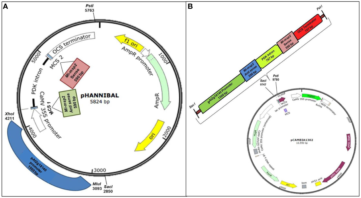 Constructs used in the study. (A) Cloning of the Mi-msp2 gene and promoter pAt2g18140 in the RNAi vector pHANNIBAL. (B) Insertion of the RNAi cassette from pHANNIBAL into the binary vector pCAMBIA 1302 expressing the dsRNA construct for pAt2g18140::Mi-msp2-RNAi.