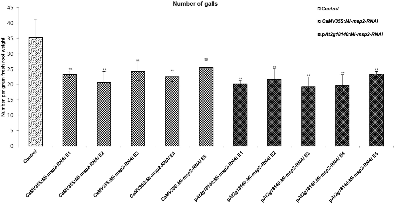 Five independent RNAi lines each for constructs CaMV35S::Mi-msp2-RNAi and pAt2g18140::Mi-msp2-RNAi exhibit a reduction in infection represented by a reduction in the number of galls compared to the control line evaluated for M. incognita infection. Each bar represents the mean ± SE. Double asterisks indicate statistically significant differences by one-way ANOVA and Tukey’s test (p ≤ 0.01).