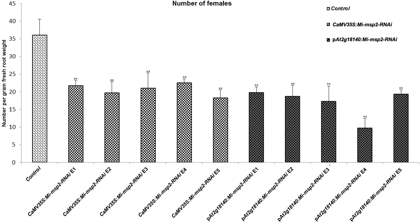 Five independent RNAi lines each for constructs CaMV35S:Mi-msp2 and pAt2g18140::Mi-msp2-RNAi exhibit a reduction in infection represented by a reduction in the number of females isolated from infected roots compared to the control line evaluated for M. incognita infection. Each bar represents the mean ± SE. Double asterisks indicate statistically significant differences by one-way ANOVA and Tukey’s test (p ≤ 0.01).