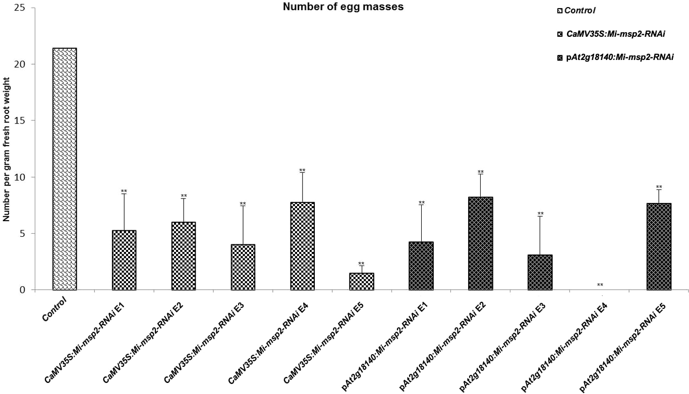 Five independent RNAi lines each for constructs CaMV35S:Mi-msp2 and pAt2g18140::Mi-msp2-RNAi showing a reduction in infection represented by a reduction in the number of egg masses produced by the females in infected roots compared to the control line evaluated for M. incognita infection. Each bar represents the mean ± SE. Double asterisks indicate statistically significant differences by one-way ANOVA and Tukey’s test (p ≤ 0.01).