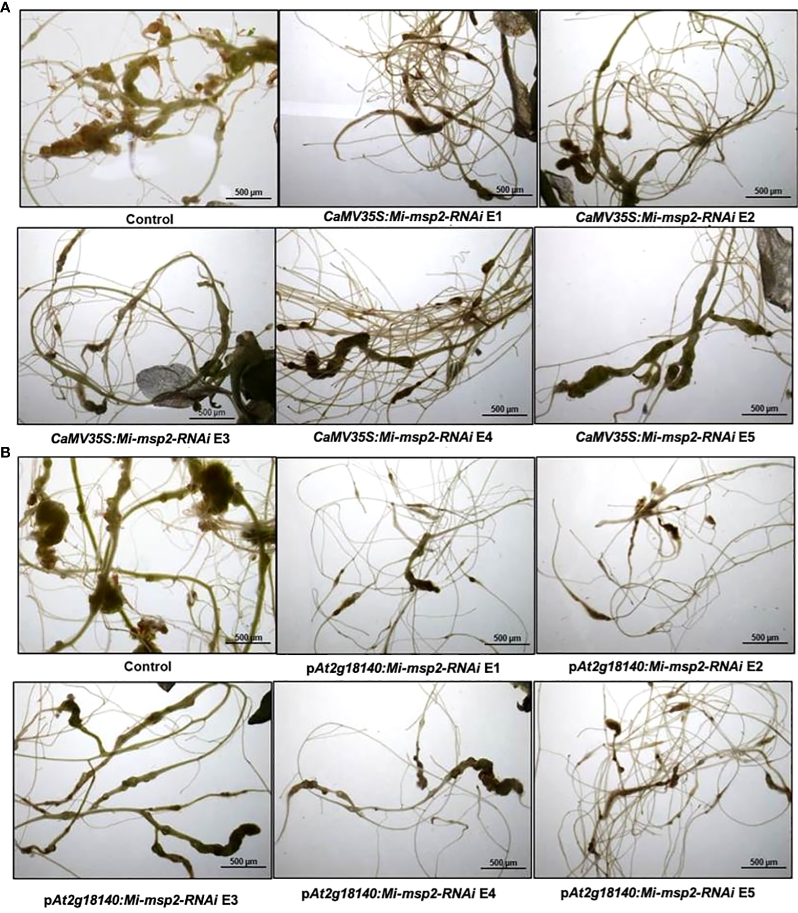 Representative images of M. incognita-infected Arabidopsis thaliana roots of control and RNAi plants. (A) Roots of a control plant compared with CaMV35S::Mi-msp2-RNAi RNAi lines (CaMV35S::Mi-msp2-RNAi E1, CaMV35S::Mi-msp2-RNAi E2, CaMV35S::Mi-msp2-RNAi E3, CaMV35S::Mi-msp2-RNAi E4 and CaMV35S::Mi-msp2-RNAi E5) and (B) Roots of a control plant compared with pAt2g18140::Mi-msp2-RNAi RNAi lines (pAt2g18140::Mi-msp2-RNAi E1, pAt2g18140::Mi-msp2-RNAi E2, pAt2g18140::Mi-msp2-RNAi E3, pAt2g18140::Mi-msp2-RNAi E4 and pAt2g18140::Mi-msp2-RNAi E5).