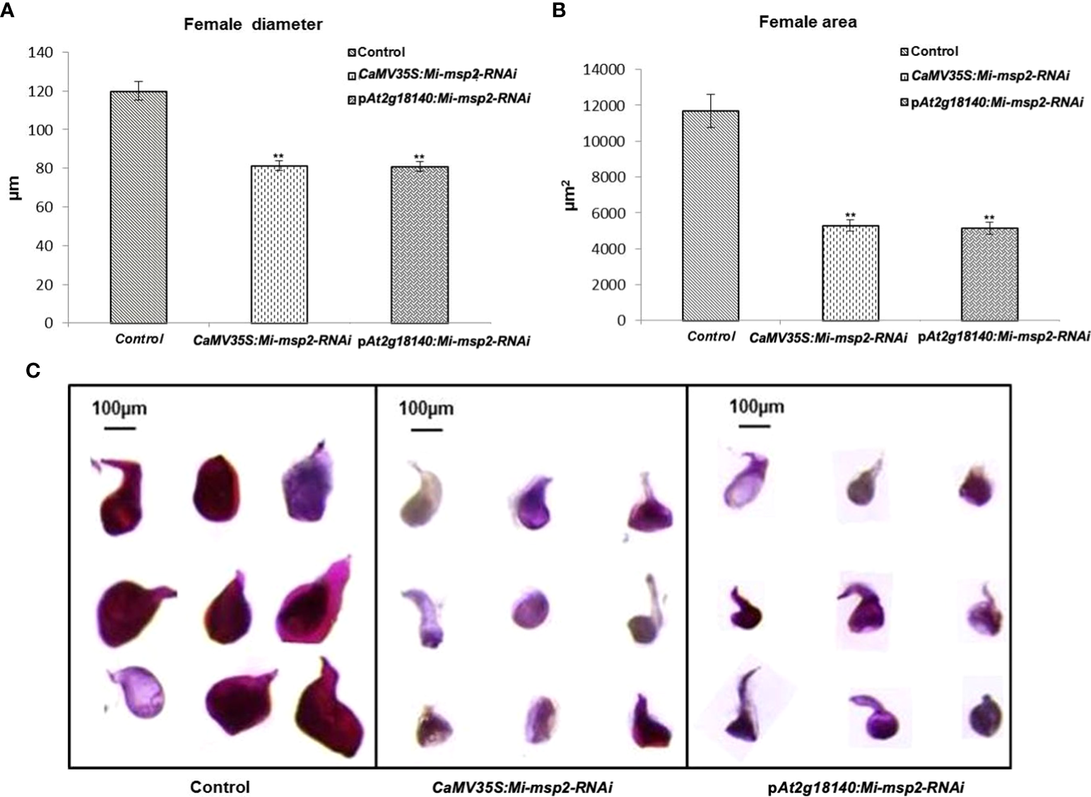 Morphological size comparison of female nematodes isolated from the control and RNAi plant lines CaMV35S::Mi-msp2-RNAi and pAt2g18140::Mi-msp2-RNAi (cumulative females from all five lines of each of the RNAi constructs). (A) Average female width (μm), (B) average female area (μm2). Each bar represents the mean ± SE. Double asterisks indicate statistically significant differences according to one-way ANOVA and Tukey’s test (p ≤ 0.01). Representative images of adult females isolated from (C) Control, CaMV35S::Mi-msp2-RNAi and pAt2g18140::Mi-msp2-RNAi RNAi lines.