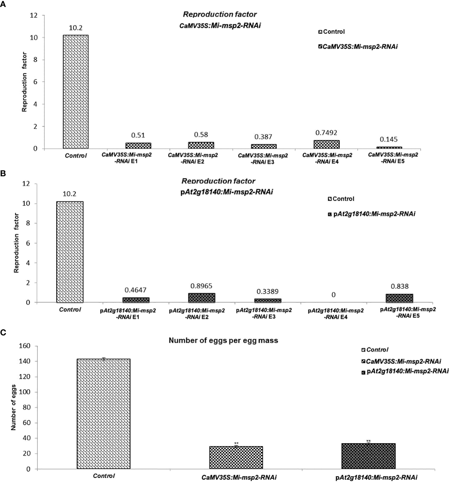 Fecundity of M. incognita. (A) Reproductive factors for the control and CaMV35S::Mi-msp2.(B) Reproductive factors for the control and pAt2g18140::Mi-msp2-RNAi.(C) The average number of eggs per egg mass isolated from the control and CaMV35S::Mi-msp2-RNAi and pAt2g18140::Mi-msp2-RNAi (cumulative egg masses from five lines of each RNAi construct). Each bar represents the mean ± SE. Double asterisks indicate statistically significant differences according to one-way ANOVA and Tukey’s test (p ≤ 0.01).