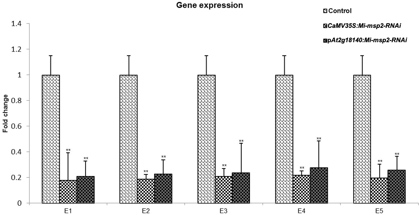 The expression of the Mi-msp2 gene was observed to be downregulated relative to the nematode actin gene in each RNAi line. The reduction in gene expression for the CaMV35S::Mi-msp2-RNAi RNAi lines was 82%, 81%, 79%, 78% and 80% for E1, E2, E3, E4 and E5, respectively, compared to the control (Figure 8). The reduction in gene expression for the pAt2g18140::Mi-msp2-RNAi lines was 79%, 77%, 76%, 72% and 74% for E1, E2, E3, E4 and E5, respectively, compared to the control (Figure 8). Thus, from the reduced transcript levels, we can conclude that dsRNA for the effector gene Mi-msp2 was efficiently expressed by the RNAi constructs under the control of both promoters CaMV35S and pAt2g18140 and that HD-RNAi-based silencing was successful for the targeted gene.