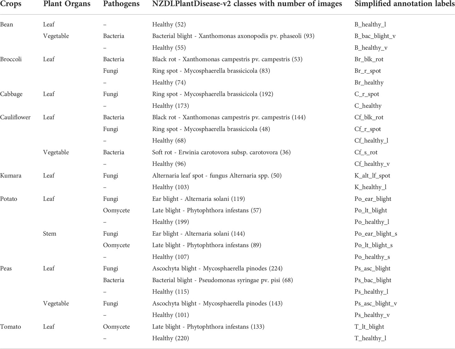 The NZDLPlantDisease-v2 dataset contains healthy/disease classes for various organs of plant species, including beans, peas, potatoes, and cauliflower. However, some crops only contain the disease in their leaves, such as broccoli, cabbage, kumara, and tomato. Therefore, data collection should be continued with other plant organs of these vegetables. Moreover, due to time constraints and weather conditions, a few other important New Zealand vegetables, such as onion, squash, and sweet corn, could not be considered.