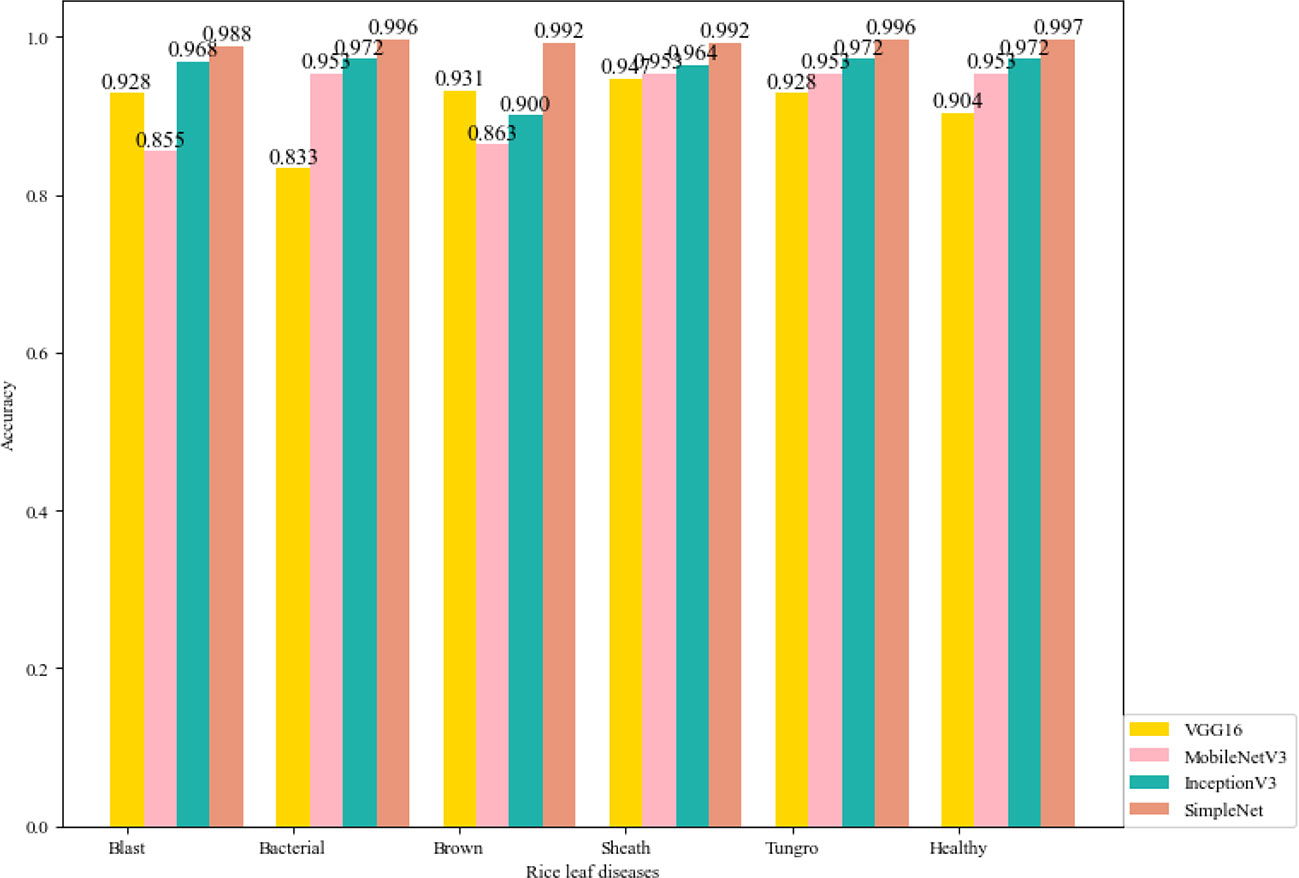 In order to observe the recognition effect of each disease more intuitively in different models, the output visualization is shown in Figure 7. For each rice disease, the SimpleNet has the highest identification accuracy, reaching more than 99.00%. For the InceptionV3 model, the accuracy of the model in identifying brown spot disease is about 90.00%, but the accuracy of recognizing other types of diseases is more than 96.00%. The accuracy of the VGG16 model and the MobileNetV2 model are not stable, which indicates the generalization ability is poor. To sum up, the experiment results show that the SimpleNet model has good identification accuracy and better robustness for the six kinds of rice leaf diseases.