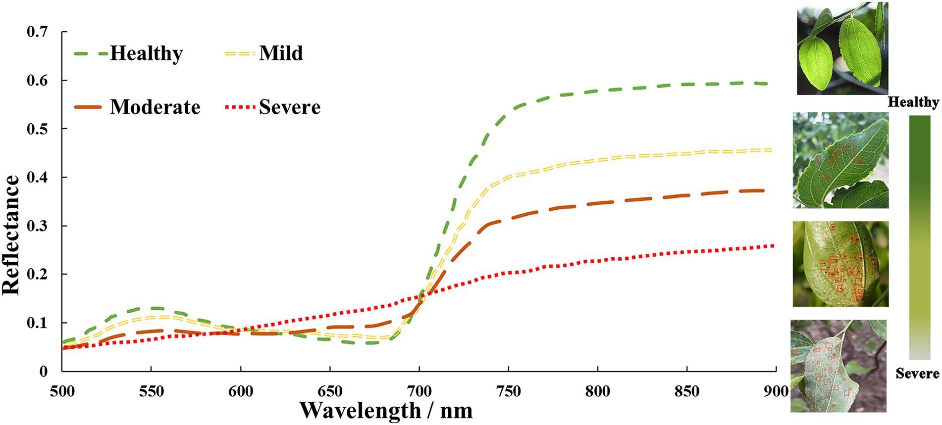 Chlorophyll content is an indicator of the biochemical parameters of the crop and reflects the growth of the crop (Qi et al., 2021). Pest infestation causes changes in the chlorophyll content of the crop. Thus, measuring chlorophyll content reveals the health and vigor of the crop. When jujube plants are infected with leaf mites, the mean SPAD value of their canopy leaves decreases gradually with an increase in the severity of leaf mite infestation (Figure 3). The results demonstrated that the SPAD value of jujube trees was negatively associated with the severity of leaf mite infestation.
