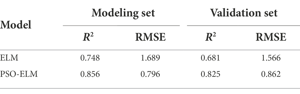 Using the 512.1, 628.8, 674.2, 736.6, and 773.2 nm bands as independent variables and the chlorophyll content as a dependent variable with ELM and PSO-ELM, respectively, the SPA method was utilized to create models for prediction of the chlorophyll content of jujube trees (as shown in Figure 9). The unoptimized ELM and PSO-ELM prediction values were utilized to compare and evaluate the actual measured data in order to confirm the prediction accuracy of the suggested models. Table 4 shows the prediction results of the PSO-ELM inversion model of jujube tree chlorophyll content used in this study were superior to those of the inversion model built with the simple extreme learning method, and the PSO-ELM model of chlorophyll content inversion (R2 = 0.856, RMSE = 0.796) was superior to that of the chlorophyll content inversion built with the single ELM (R2 = 0.748, RMSE = 1.689).