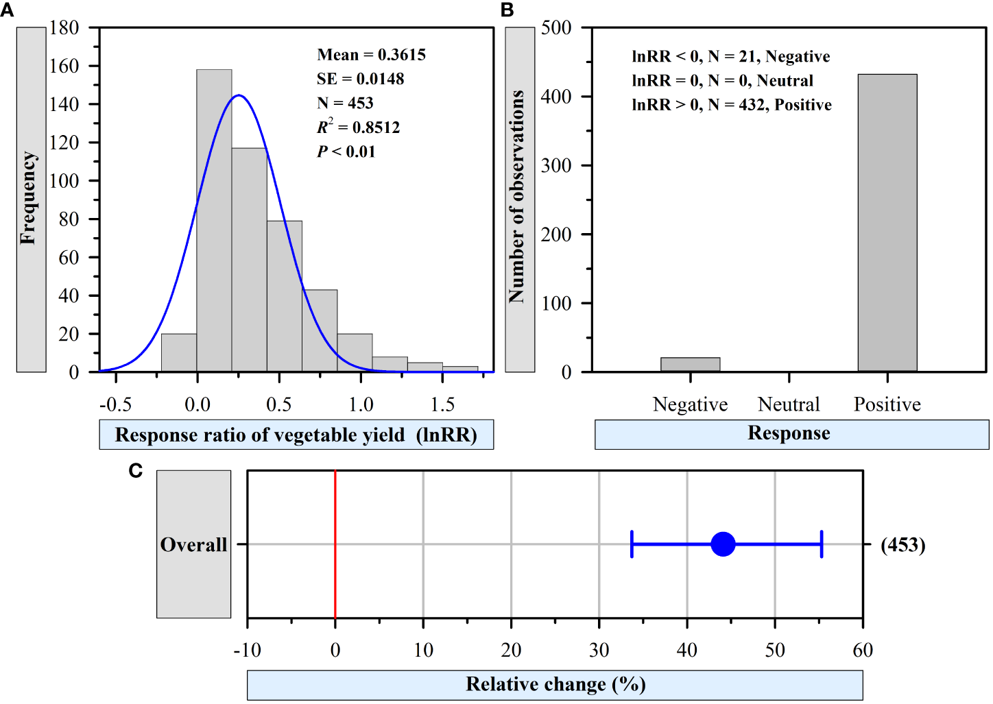 Frequency distribution of response ratio (lnRR) (A), numbers of response (B), and overall effect (C) of vegetable yield with organic fertilizer compared to that with no fertilizer. The blue fitted curve is the estimated Gaussian distribution of the frequency, and N represents the number of comparisons. The number of observations is shown right parenthesis. The blue horizontal bar represents the 95% confidence interval (CI). The CI does not overlap with 0 red line, which indicates significant positive effect at P < 0.05.