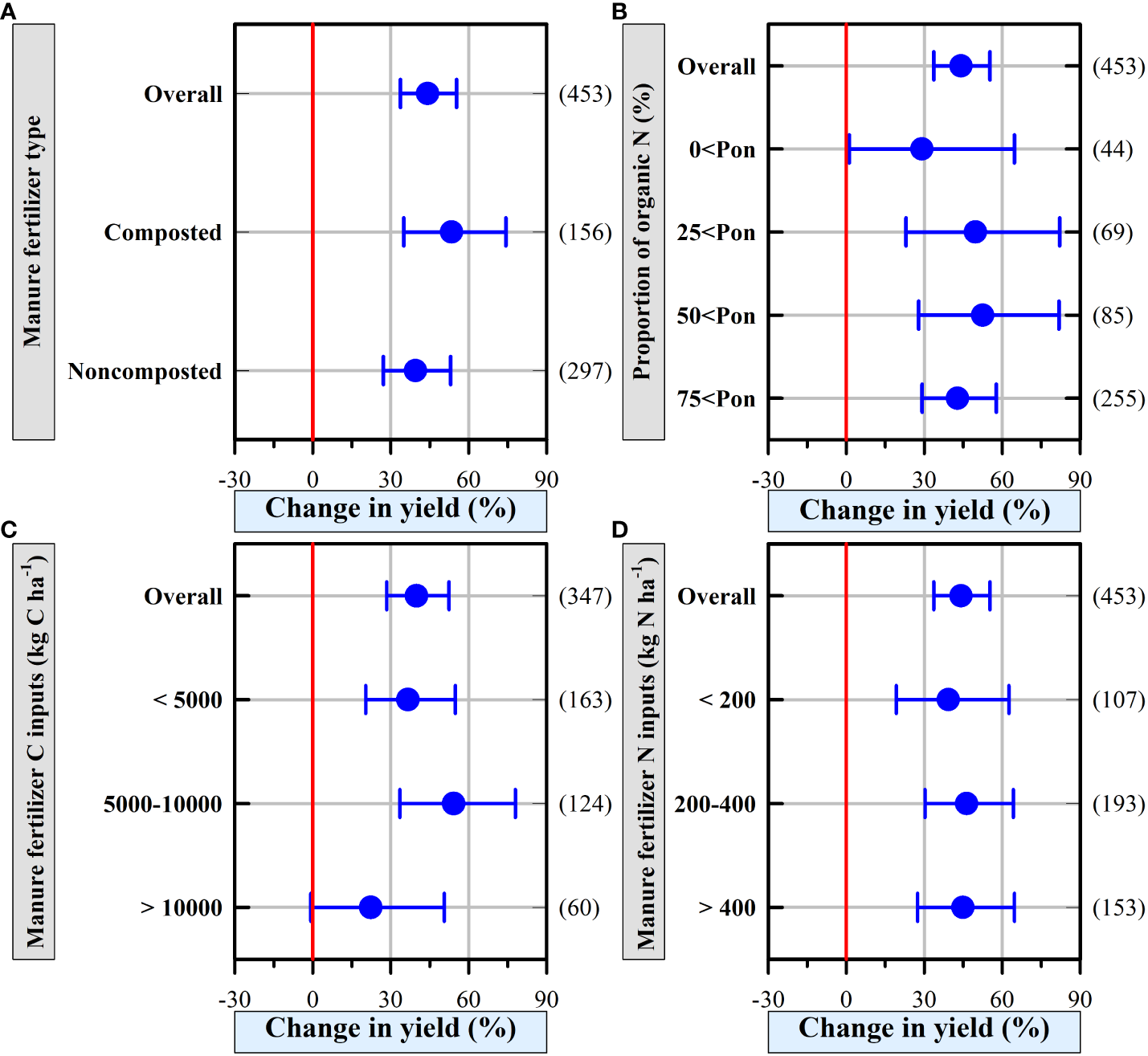 The effects of organic fertilizer properties (A) manure fertilizer type, (B) proportion of organic N, (C) manure fertilizer C inputs, and (D) manure fertilizer N inputs on greenhouse vegetable yield. The numbers of observations are shown right parentheses. The blue horizontal bars represent the 95% confidence intervals (CIs). If the CI does not overlap with 0 red line, which indicates a significant effect at P < 0.05.