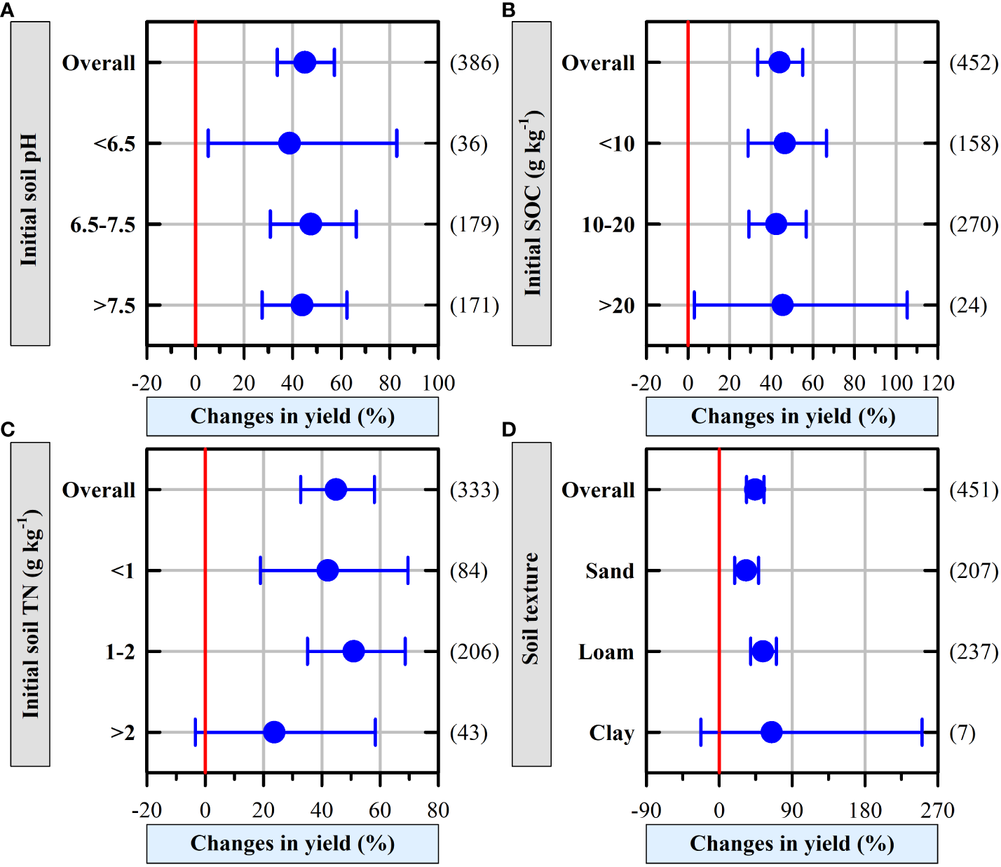 The effects of soil properties (A) initial soil pH, (B) initial SOC, (C) initial soil TN, and (D) soil texture on greenhouse vegetable yield. The numbers of observations are shown right parentheses. The blue horizontal bars represent the 95% confidence intervals (CIs). If the CI does not overlap with 0 red line, which indicates a significant effect at P < 0.05.