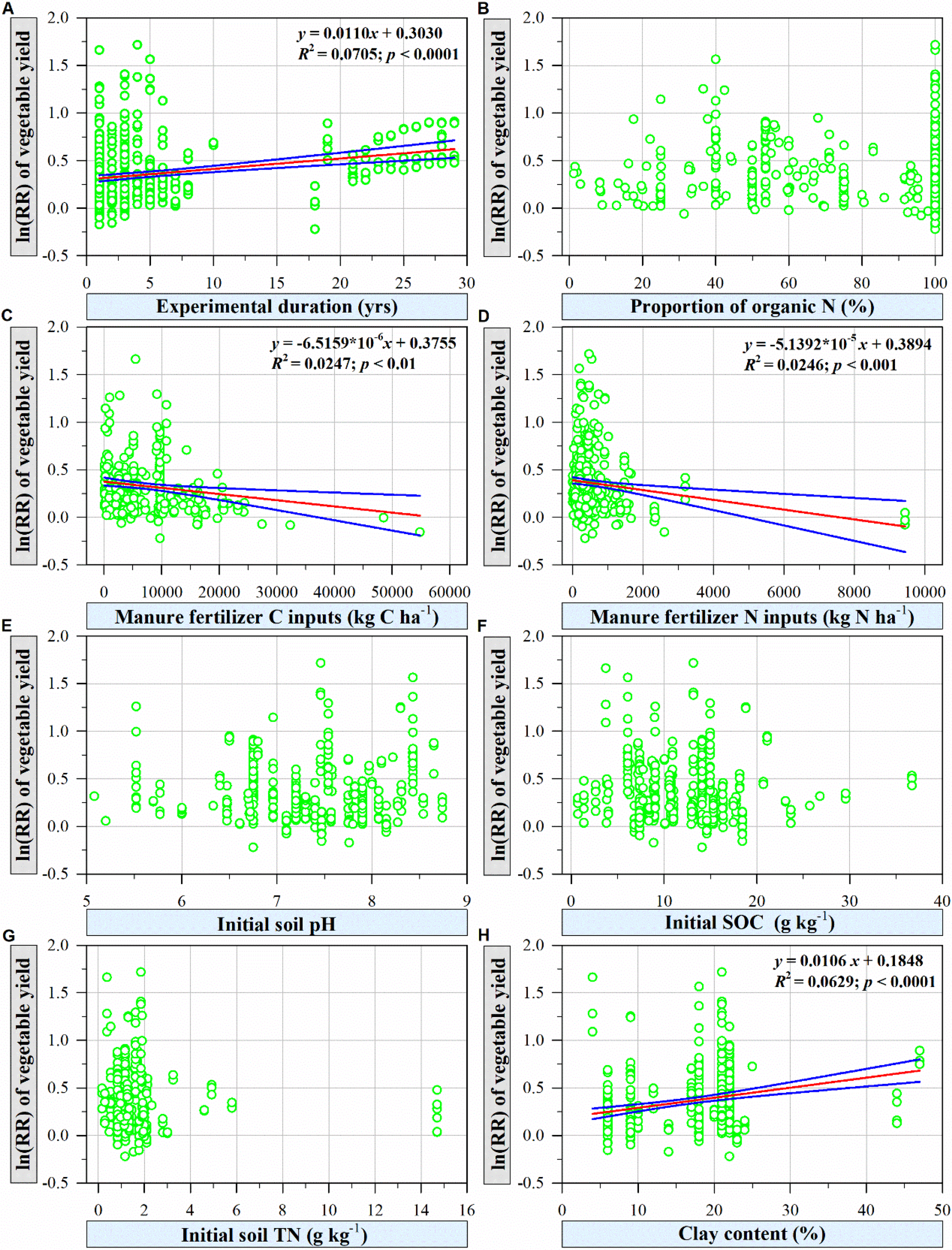 Relationships between the ln(RR) of vegetable yield under organic fertilization compared to that under no fertilization with different experimental conditions [(A), experimental duration; (B), proportion of organic N], organic fertilizer properties (C), manure fertilizer C inputs; (D), manure fertilizer N inputs) and soil properties [(E), initial soil pH; (F), initial SOC; (G), initial soil TN, and (H), soil clay content]. The red fitted lines show the OLS regression, and the areas between the two blue lines represent the 95% confidence intervals of the fitted regression model.