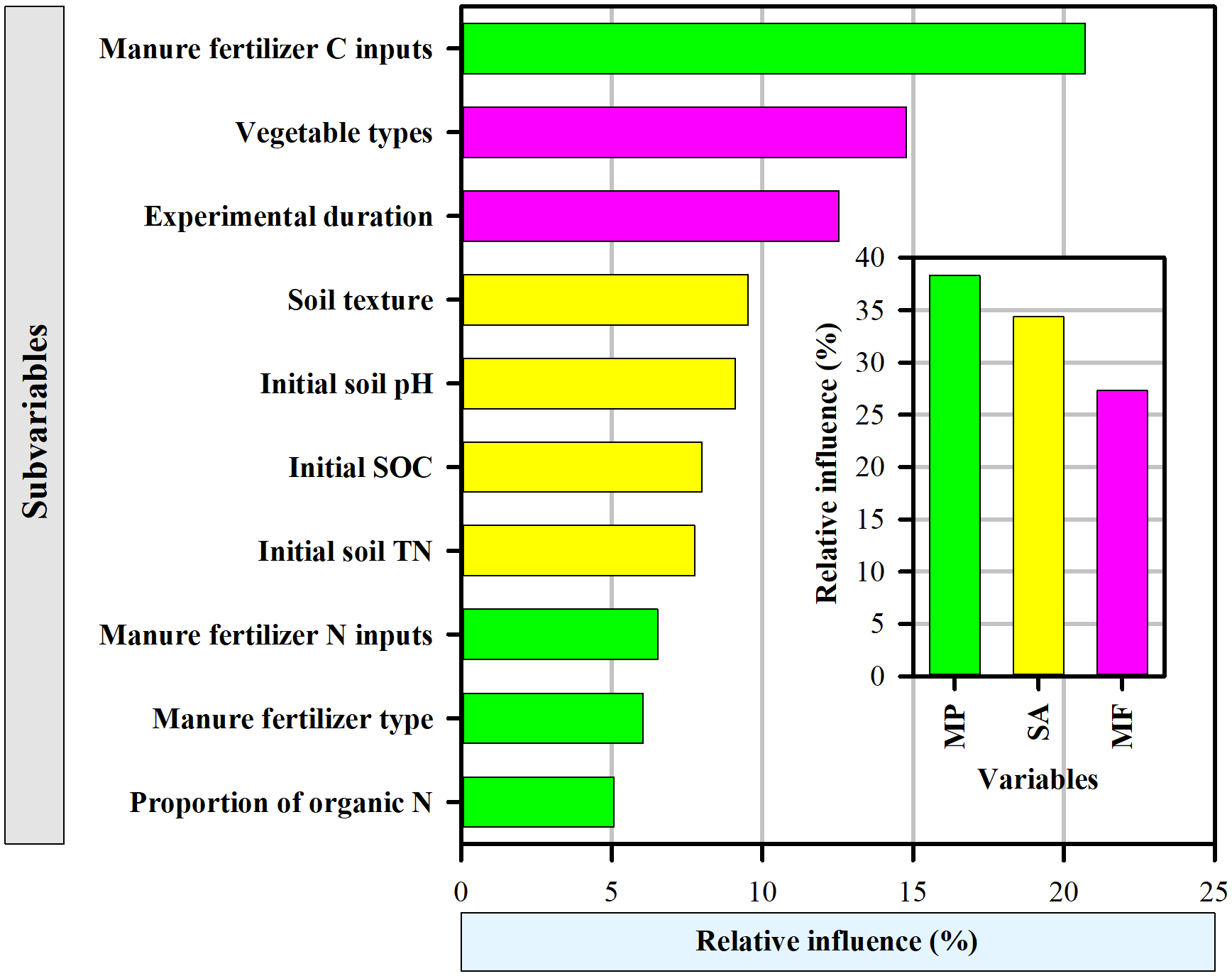 The relative influence (%) of organic fertilizer properties (i.e., organic fertilizer C inputs, proportion of organic N, organic fertilizer type, organic fertilizer N inputs), soil properties (i.e., initial soil total nitrogen, initial soil organic carbon, initial soil pH, soil texture) and managerial factors (i.e., experimental duration, vegetable types) on vegetable yield based on aggregated boosted tree (ABT) model analysis. Figure abbreviations denote manure properties (MP), soil properties (SA), managerial factors (MF).
