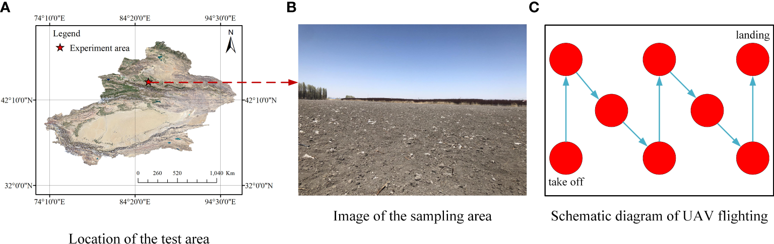 Test area and image acquisition. (A) Location of the test area; (B) Image of the sampling area; (C) Schematic diagram of UAV flighting.