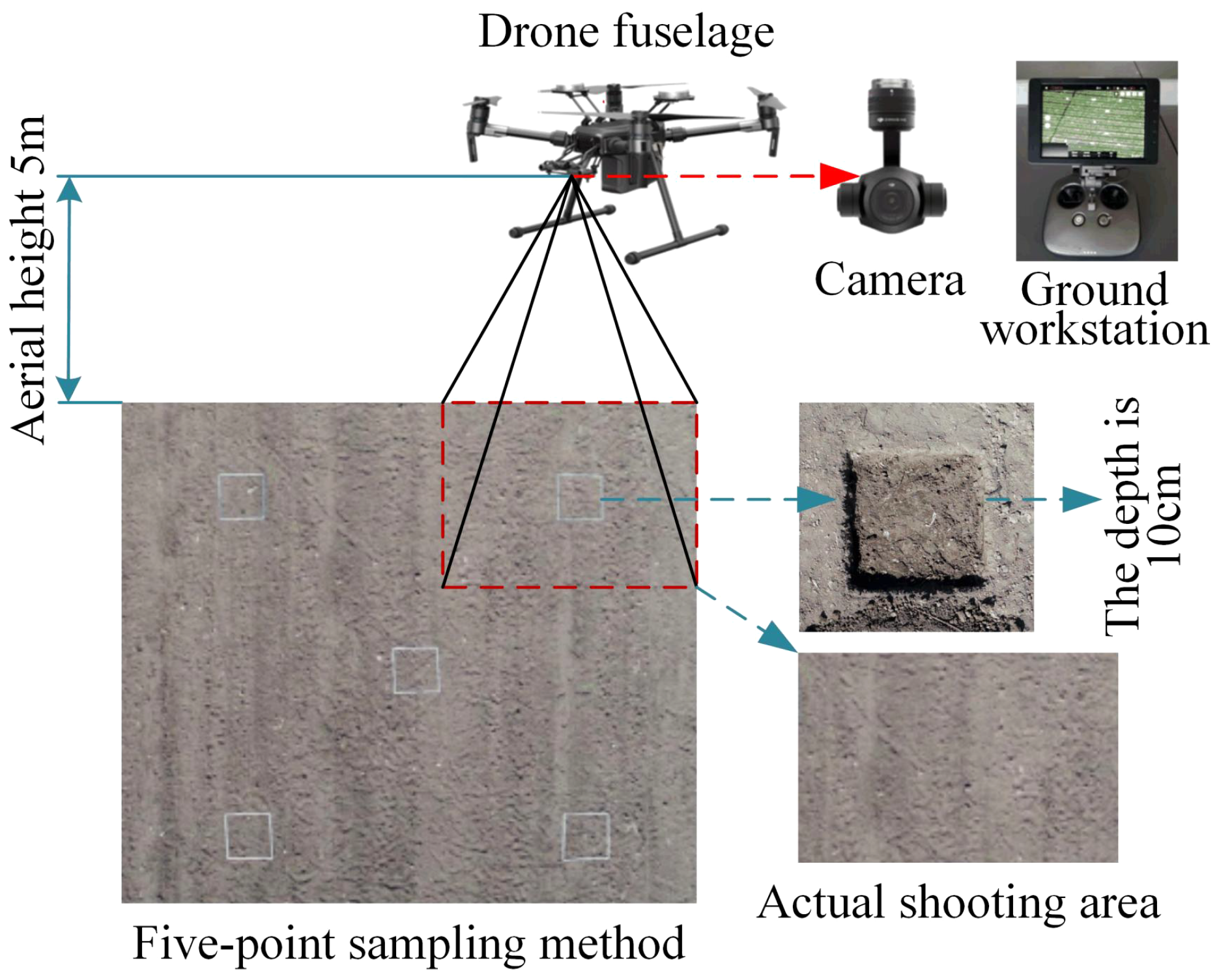 The images of the cotton field were taken by a DJI M200 remote-controlled rotary-wing quadrotor drone (DJI MATRICE 200 V1, DJI, China) equipped with a ZENMUSE X4S cloud platform camera (FC6510, DJI, China). The camera had a fixed focal length of 8.8 mm, a F/2.8-11 focal ratio, and a field of view (FOV) of 84°. The resolution of the image was 5472×3078 pixels (JPG format). A DJI ground workstation (DJI, Shenzhen, China) was used to control the flight of the drone and transmit the images. After the drone landed, the images obtained were transferred to a laptop in the JPG format and checked for integrity. The sampling tools used for the collection of the residual film in the plough layer included a 1 m × 1 m folding ruler, a shovel, and a canvas. The equipment configuration and data acquisition process are shown in Figure 2.