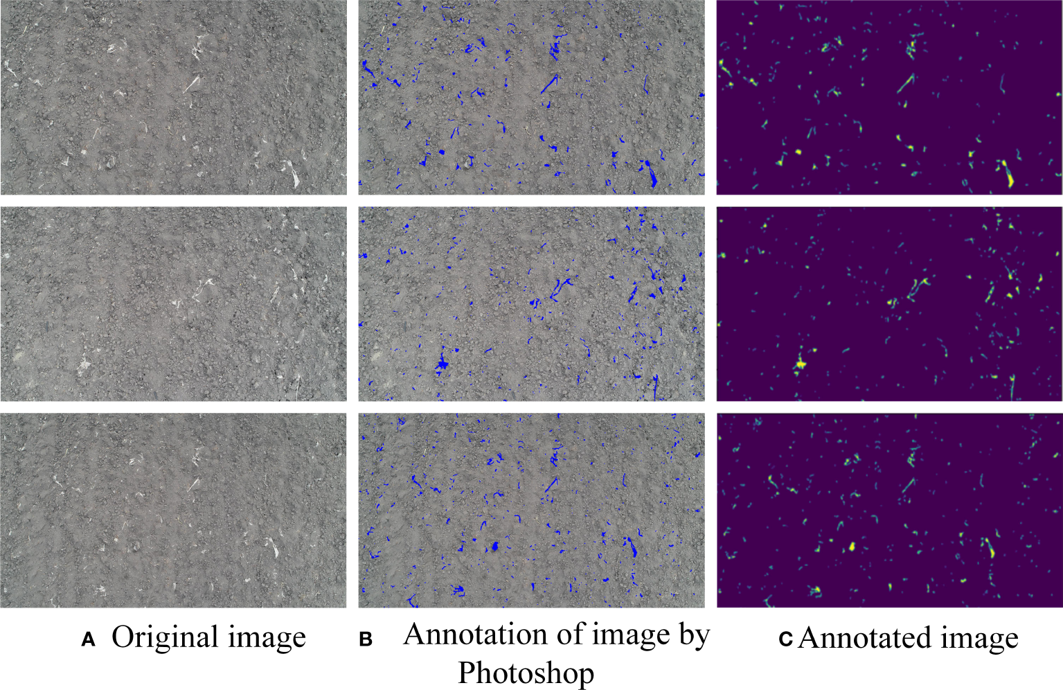 Schematic diagram of data annotation. (A) Original image; (B) Annotation of image by Photoshop; (C) Annotated image.
