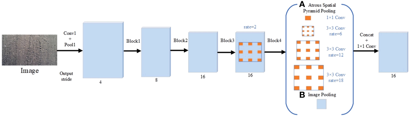 Schematic diagram of the DeepLabv3 structure. (A) Atrous Spatial Pyramid Pooling; (B) Image Pooling.