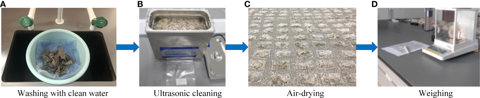 Calculation process of the residual film weight. (A) Washing with clean water; (B) Ultrasonic cleaning; (C) Air-drying; (D) Weighing.
